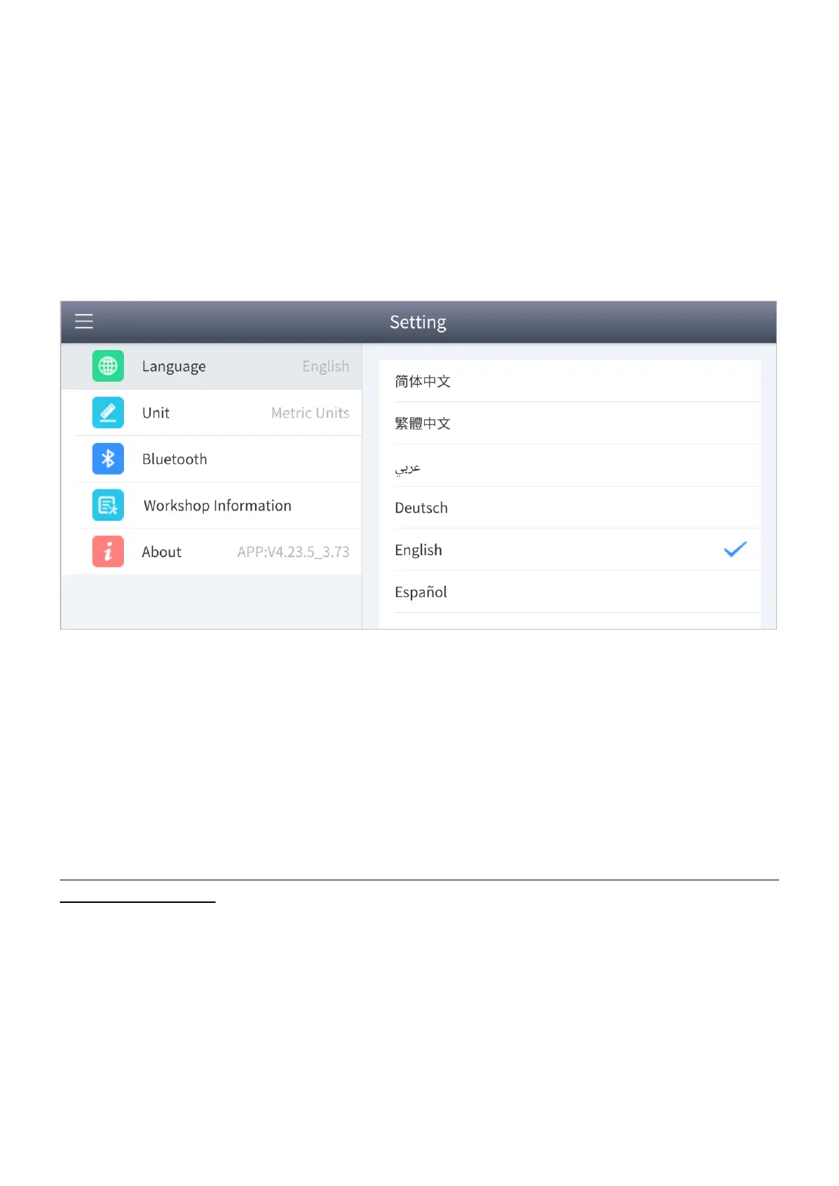 The app languages supported by the device are listed in Setting. The default language is