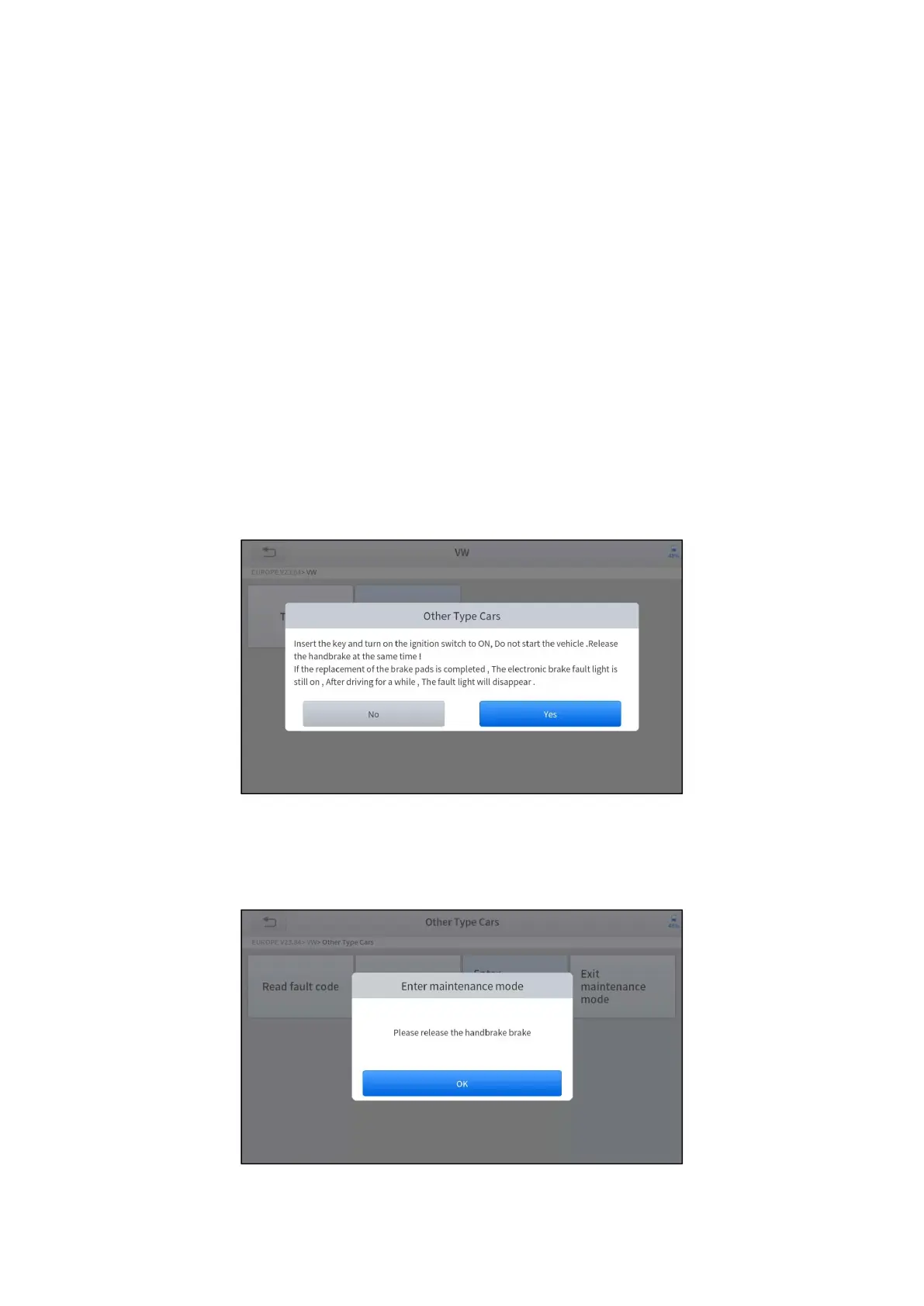 3. Enter the Enter maintenance mode menu and release the handbrake brake. And press OK after completing the