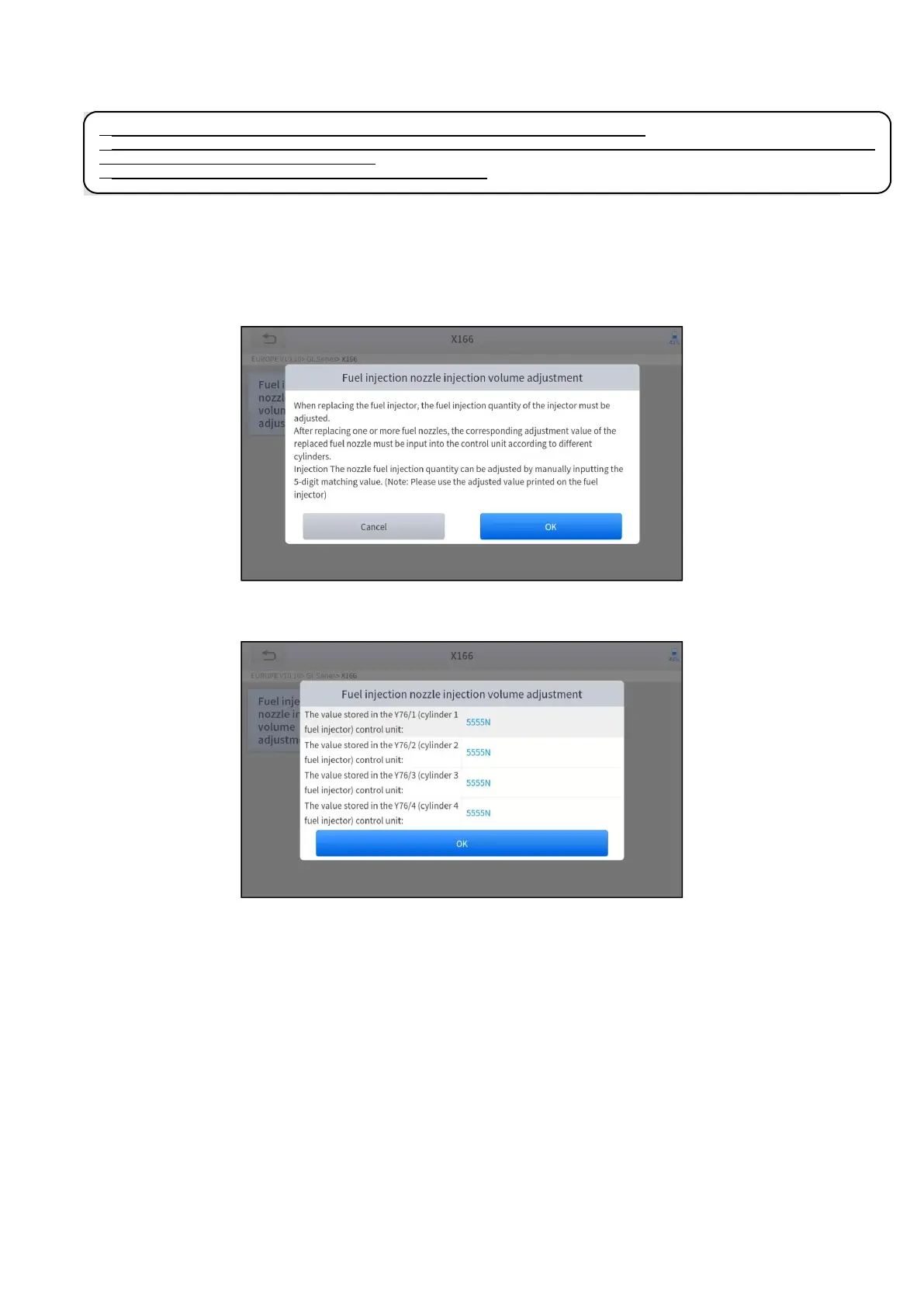 5. Enter the Change the value of cylinder menu of the replaced injector(s), enter the new 5-digit value, and then