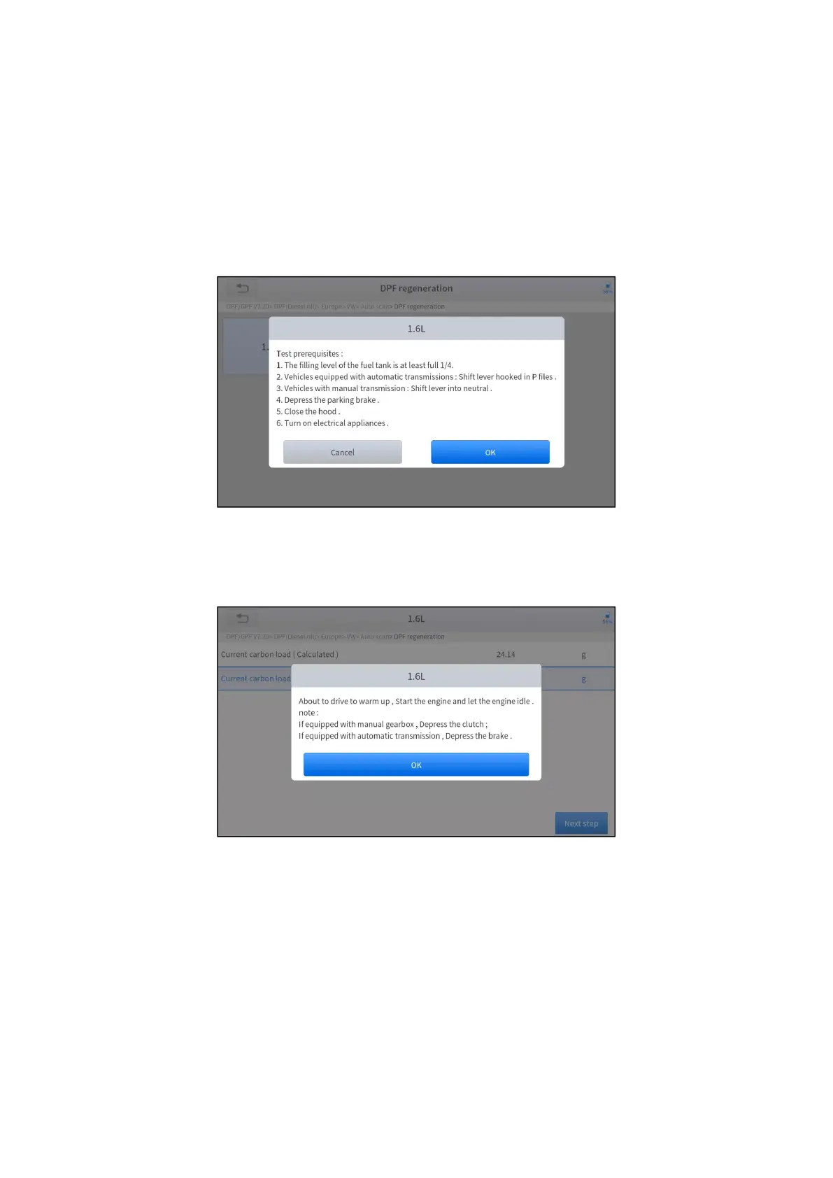 3. Read carefully and complete the requisites listed before performing the DPF regeneration function. Press OK after