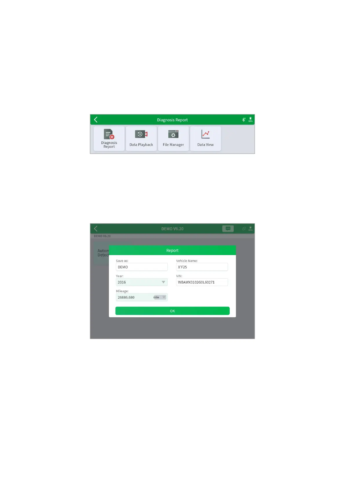 Diagnostic Report is used for viewing and printing the saved files, such as Live Data, Trouble codes or pictures generated