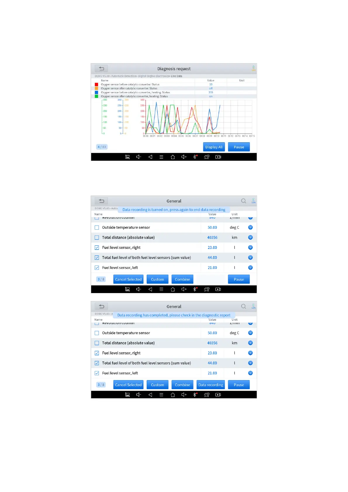 The scan tool supports recording the current data values in the form of text. You can view the recorded files in