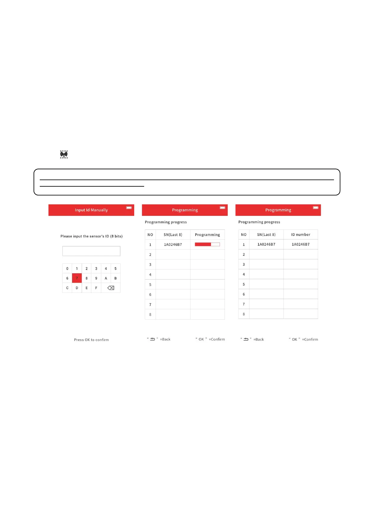 To program the sensor, select “manually input ID” on the tool, then input the ID, press OK key to confirm.