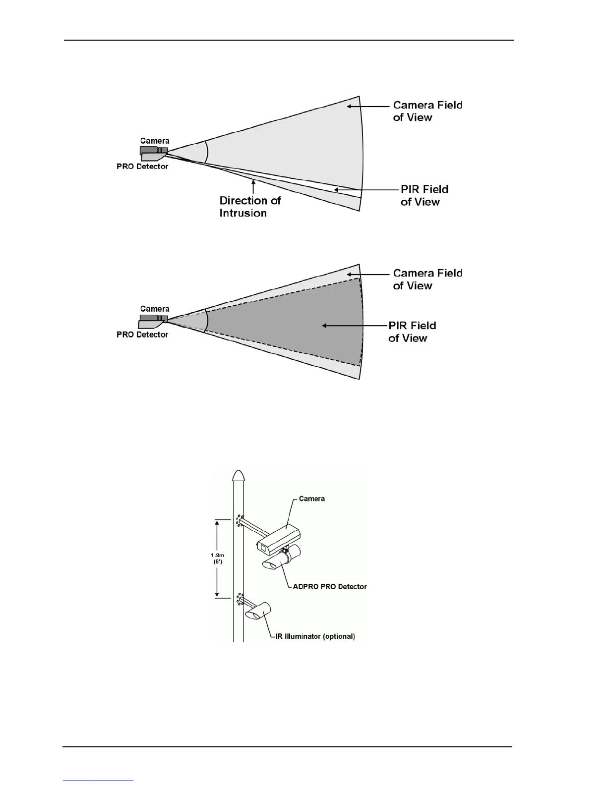 The following diagrams illustrate the alignment of a long range PIR with the camera field of view,