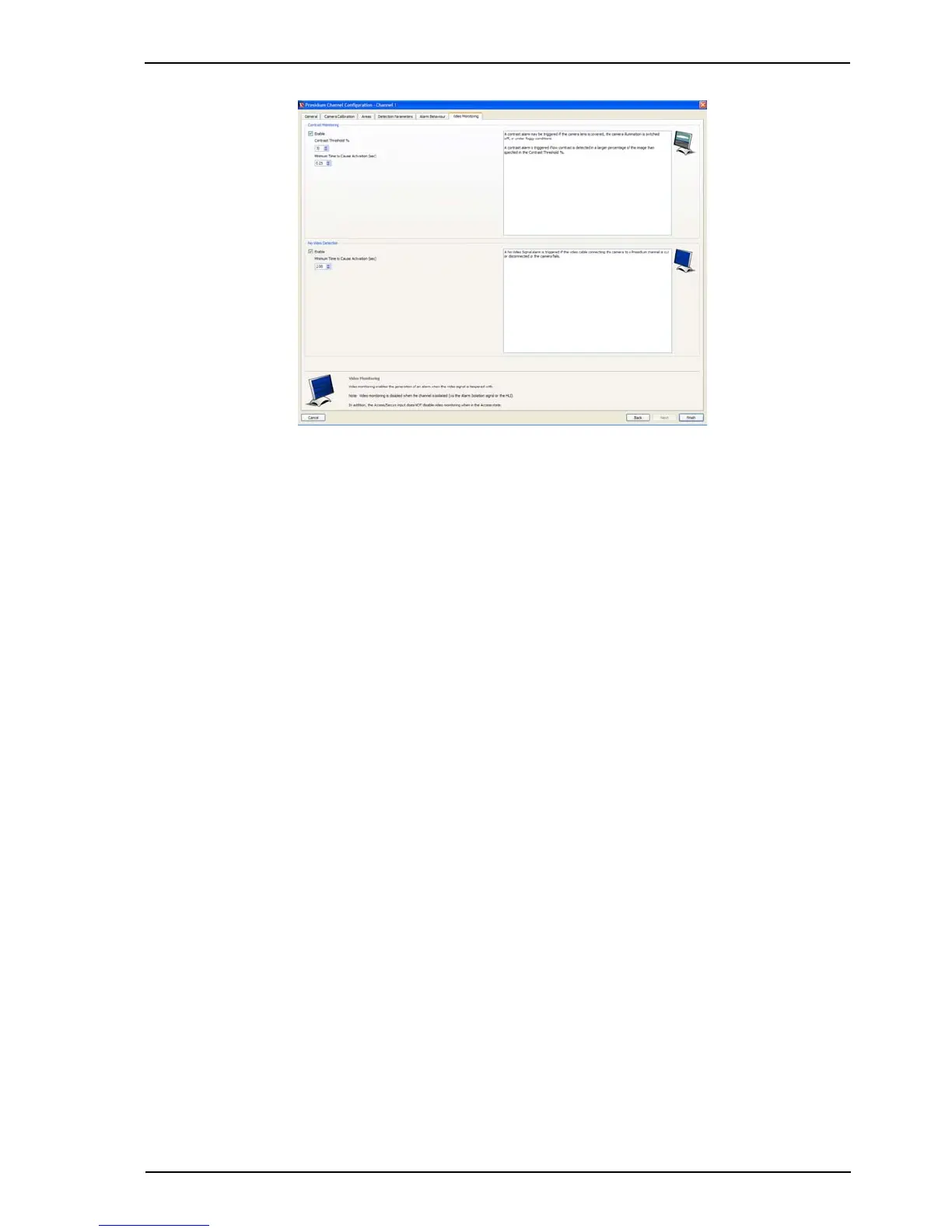 Video Monitoring enables the generation of an alarm when the video signal is tampered with or a