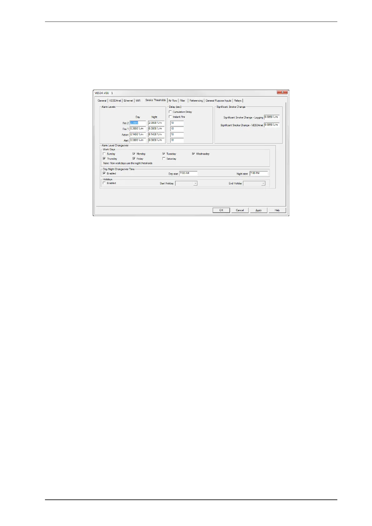 l Day Thresholds: The settings for day time smoke thresholds. The threshold and the delay are used