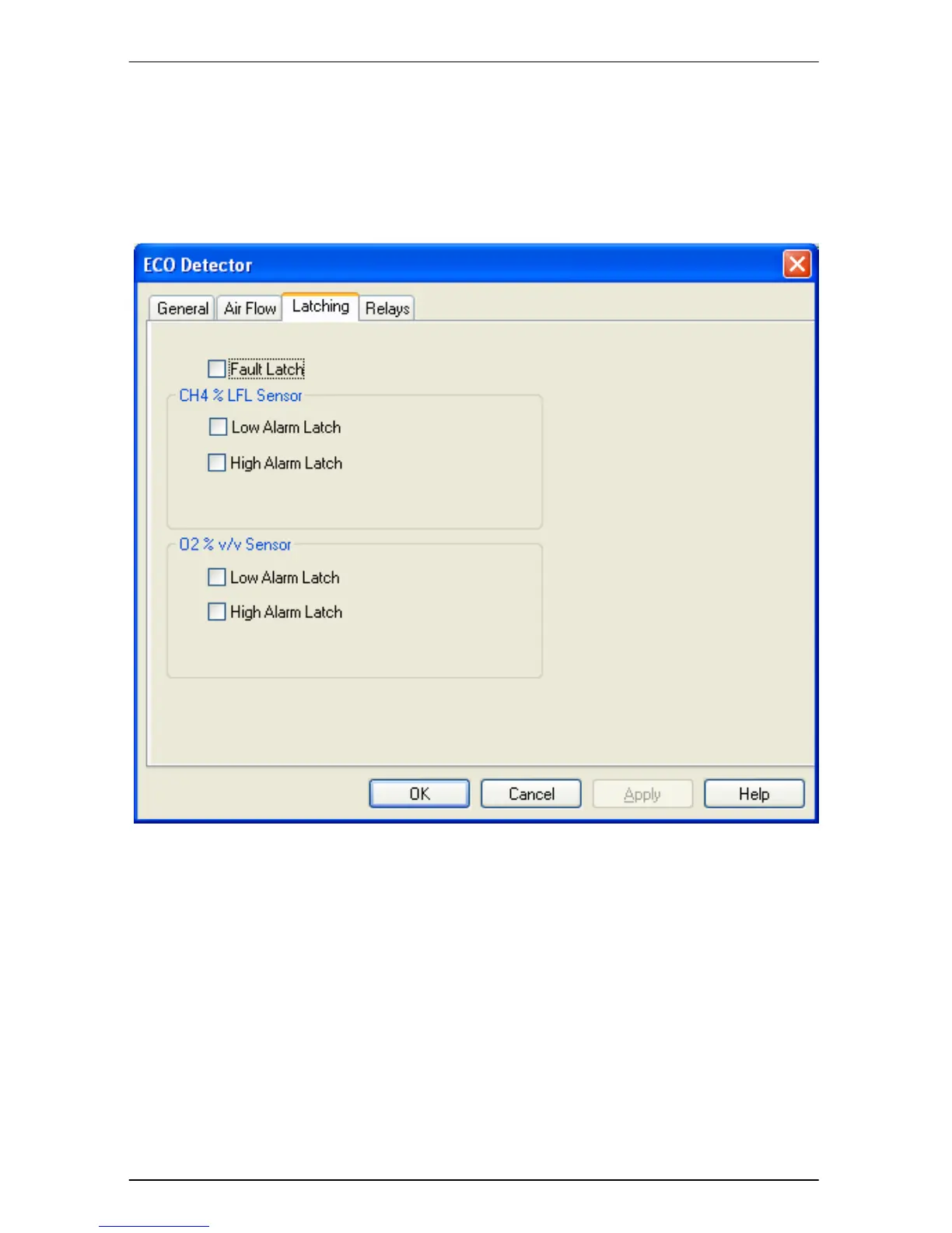 The ‘Latching’ tab, seen in Figure 29 ECO Detector, Latching Tab allows the