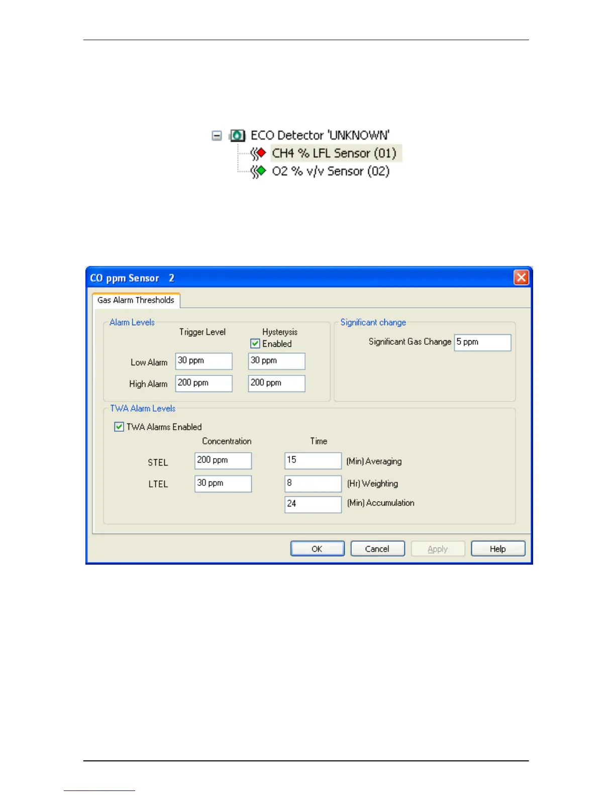 The sensor dialog allows the configuration of Low and High Alarm Thresholds, TWA