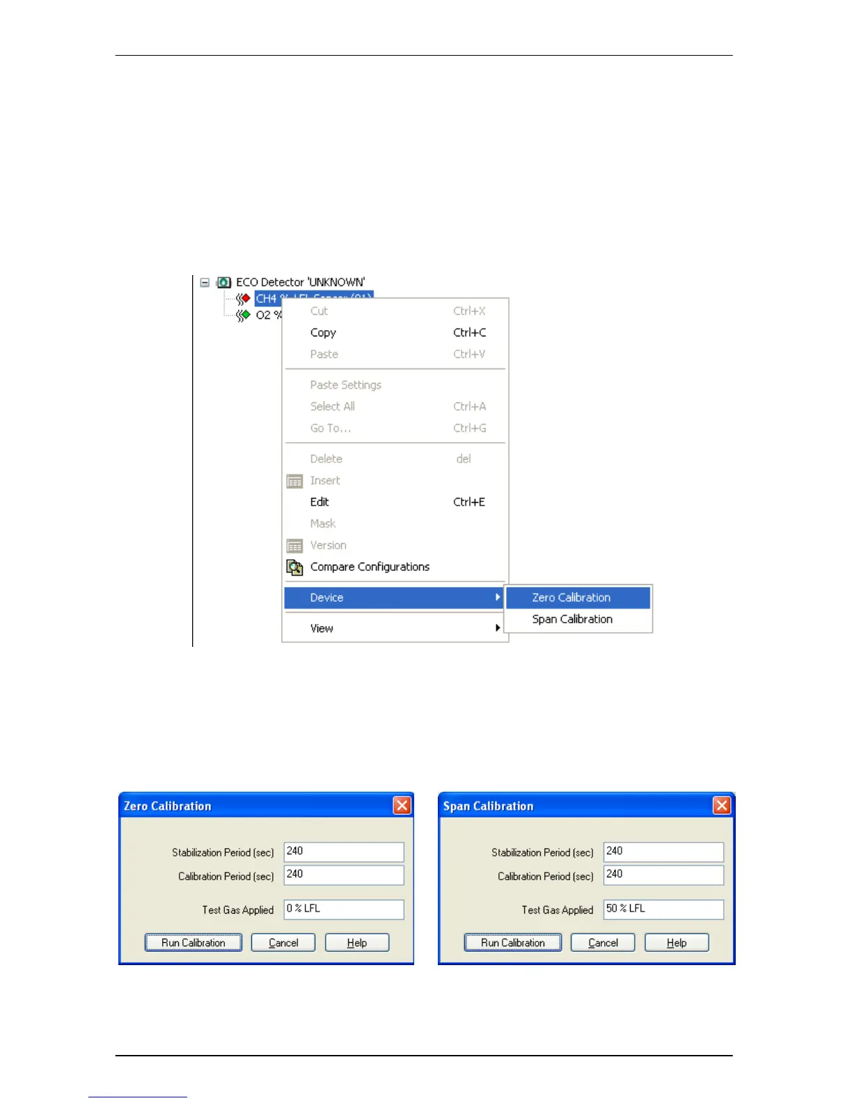 Zero and Span calibration for each sensor is performed by right clicking on the