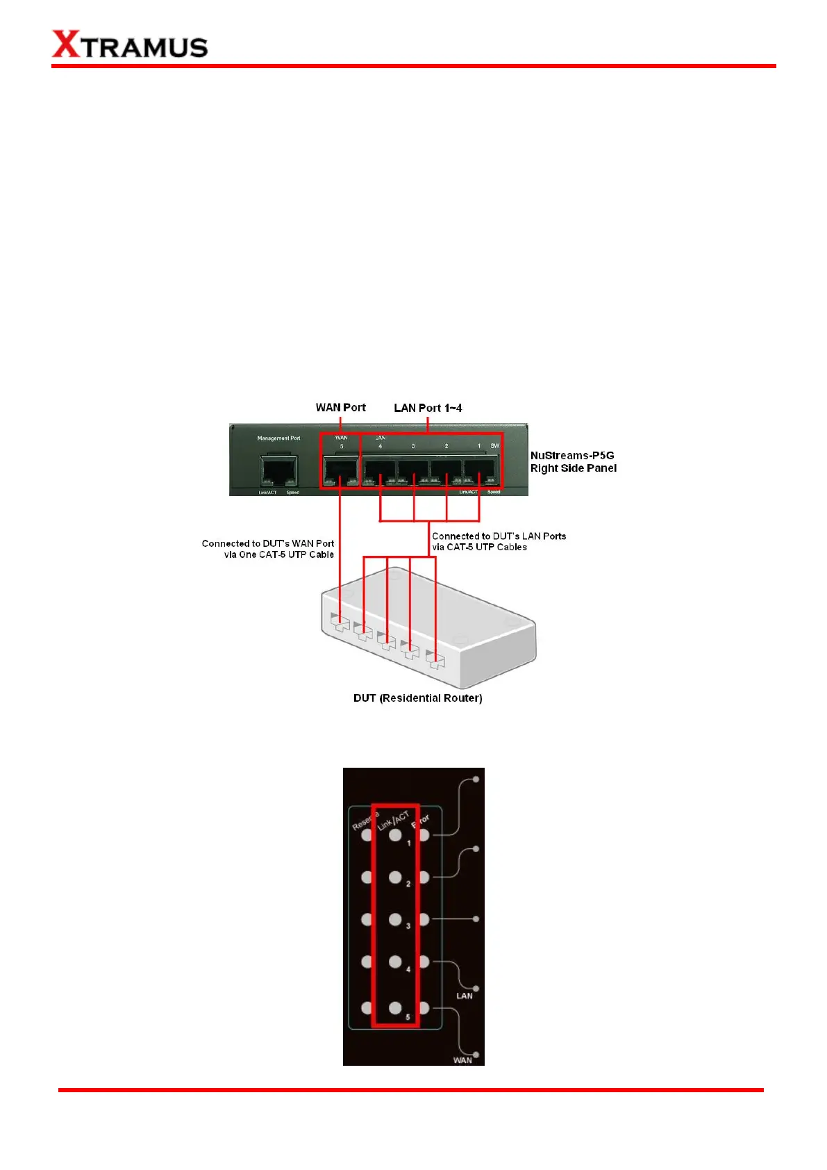 DUT must be connected to NuStreams-P5G with CAT-5 UTP cables as shown in the figure down below: