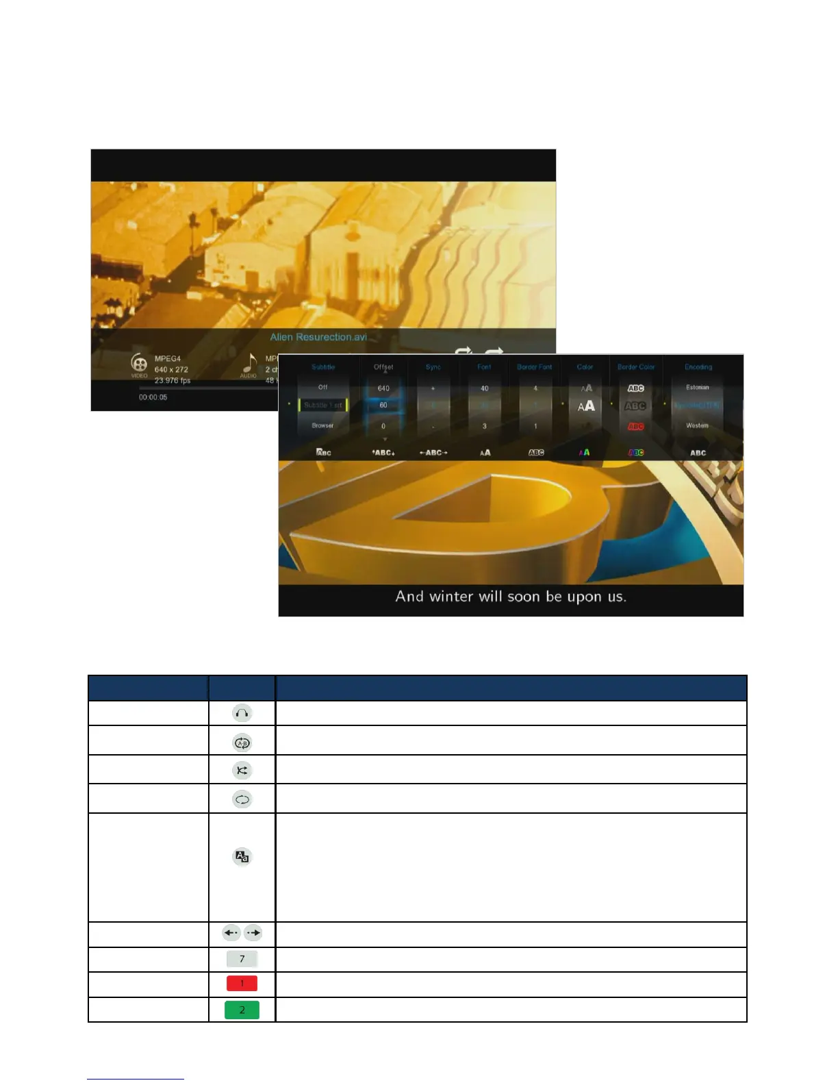 1. Subtitle: Selecting subtitle file; both internal & external subtitle files are supported.