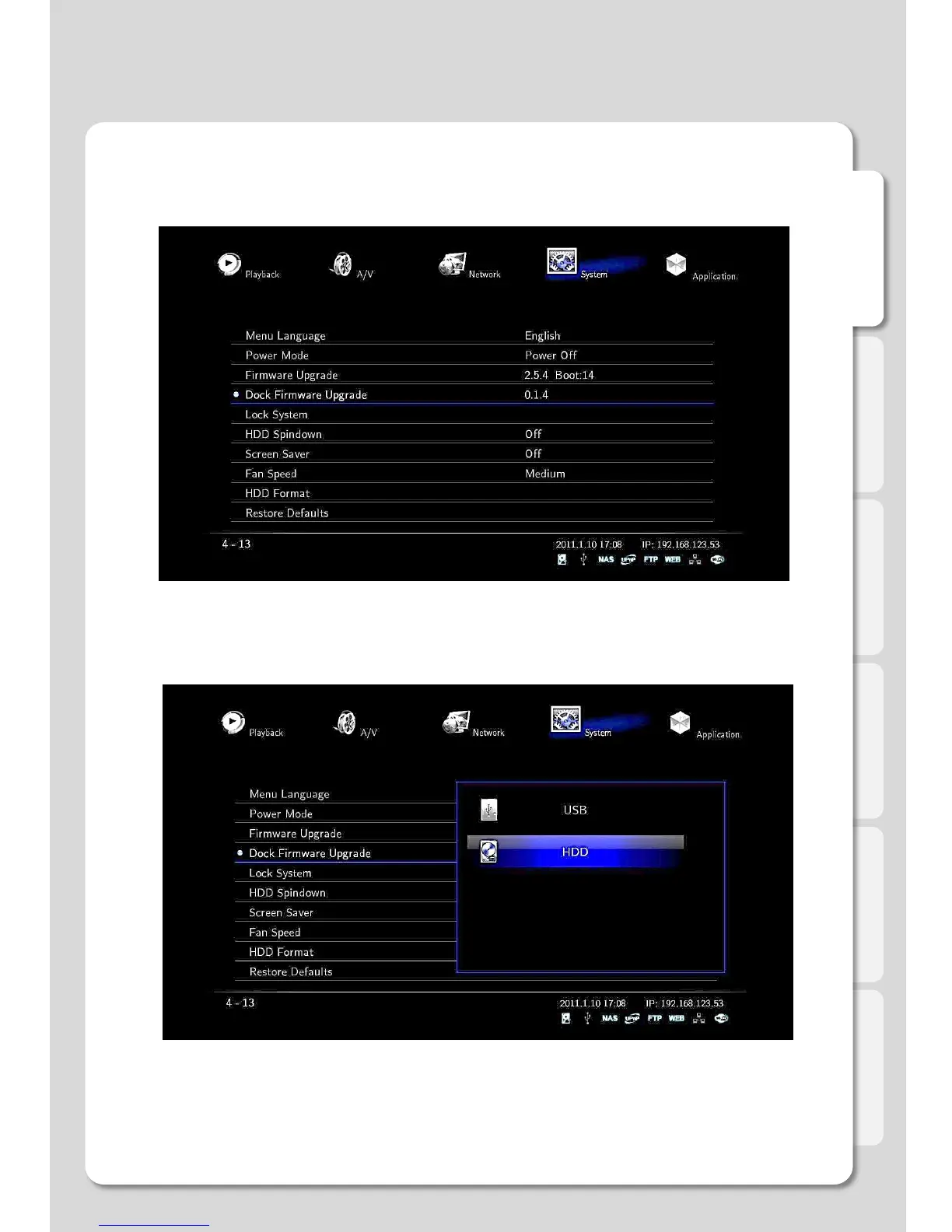 HDD or USB needs to be connected to upgrade Dock firmware .