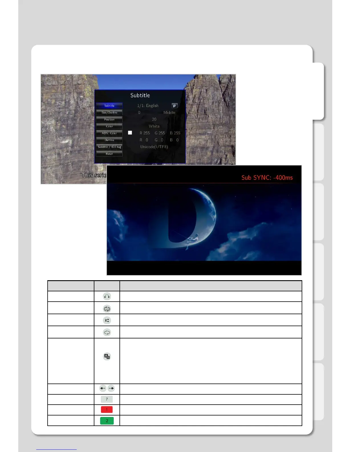 1. Subtitle: Selecting subtitle file; both internal & external subtitle files are supported.