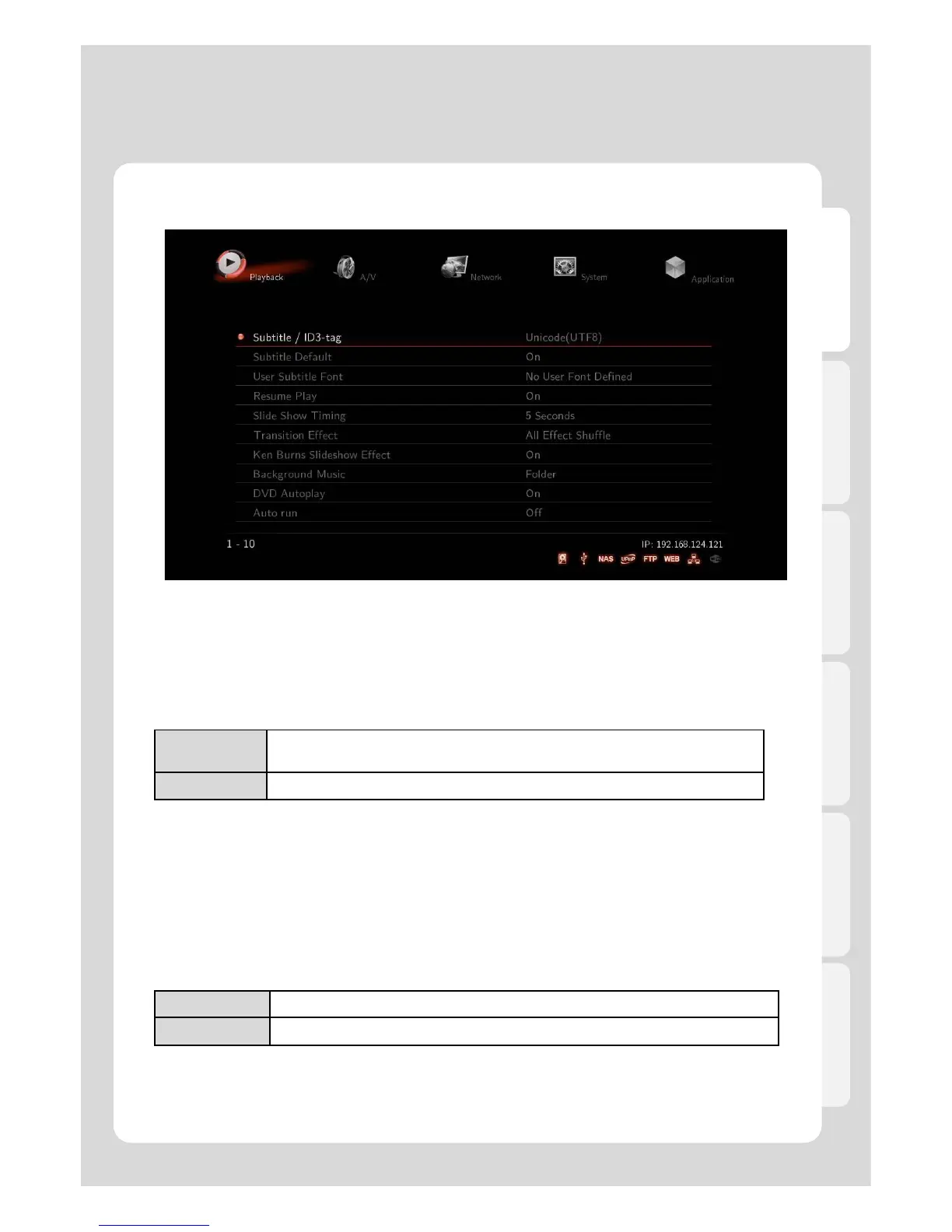 For example [Setting] – [Playback] – [Subtitle/ID3-tag] – [Thai].