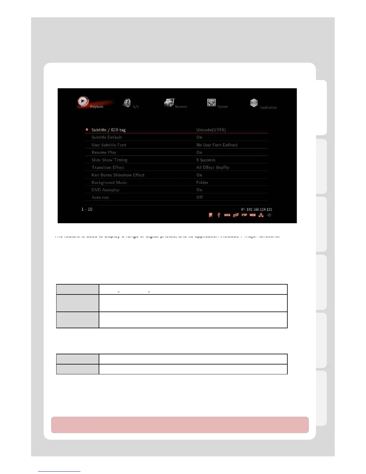 Note : Add up your file lists to Playlist by selecting [Media Library] – Tap Menu [Music/Photos/Movies] in order to