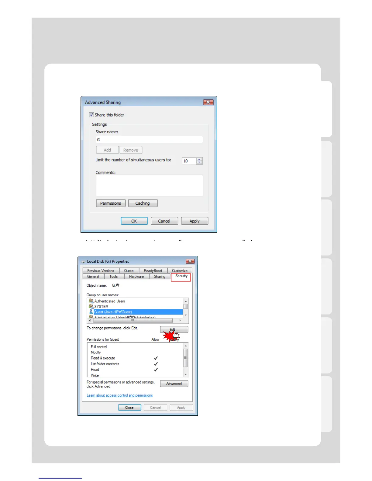 12. Confirm if there are both “Guest” and “Everyone” accounts or not on “Security” tap menu.