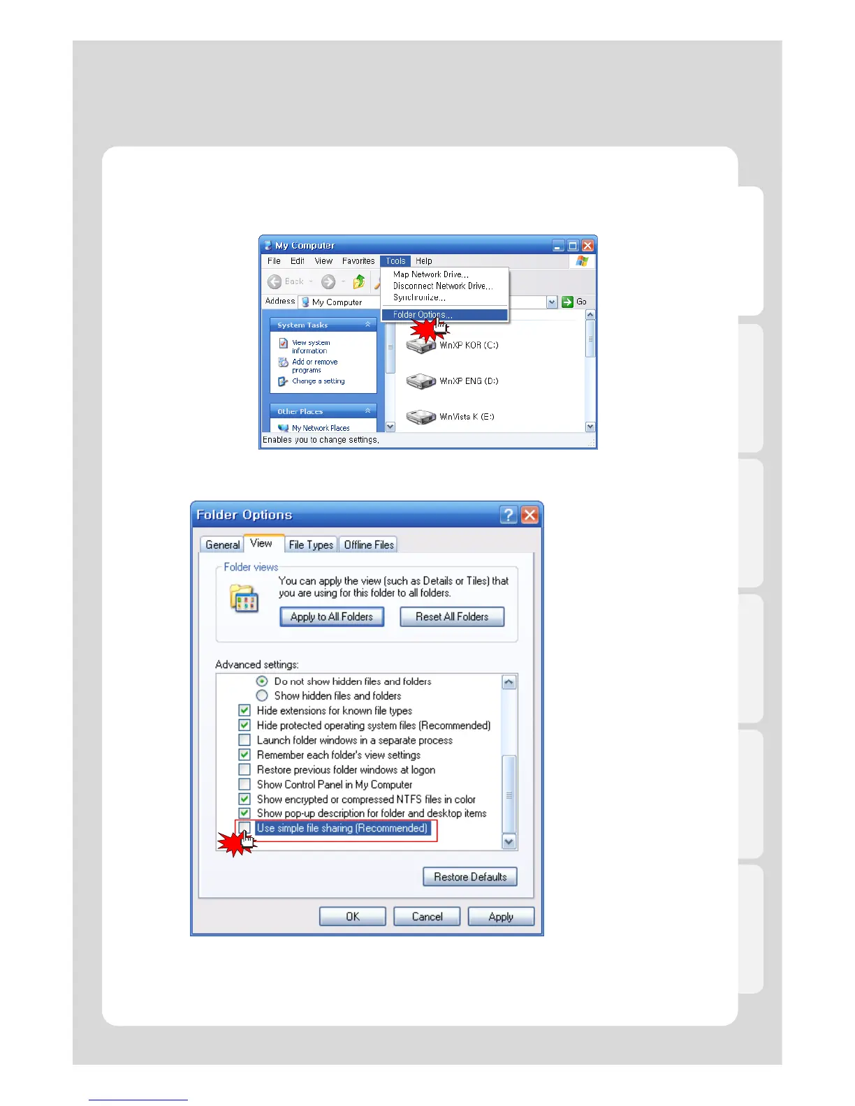 2. Click [Folder Options…] – [View] – [Use Simple File Sharing (Recommended)] in “Advanced settings” – [OK].