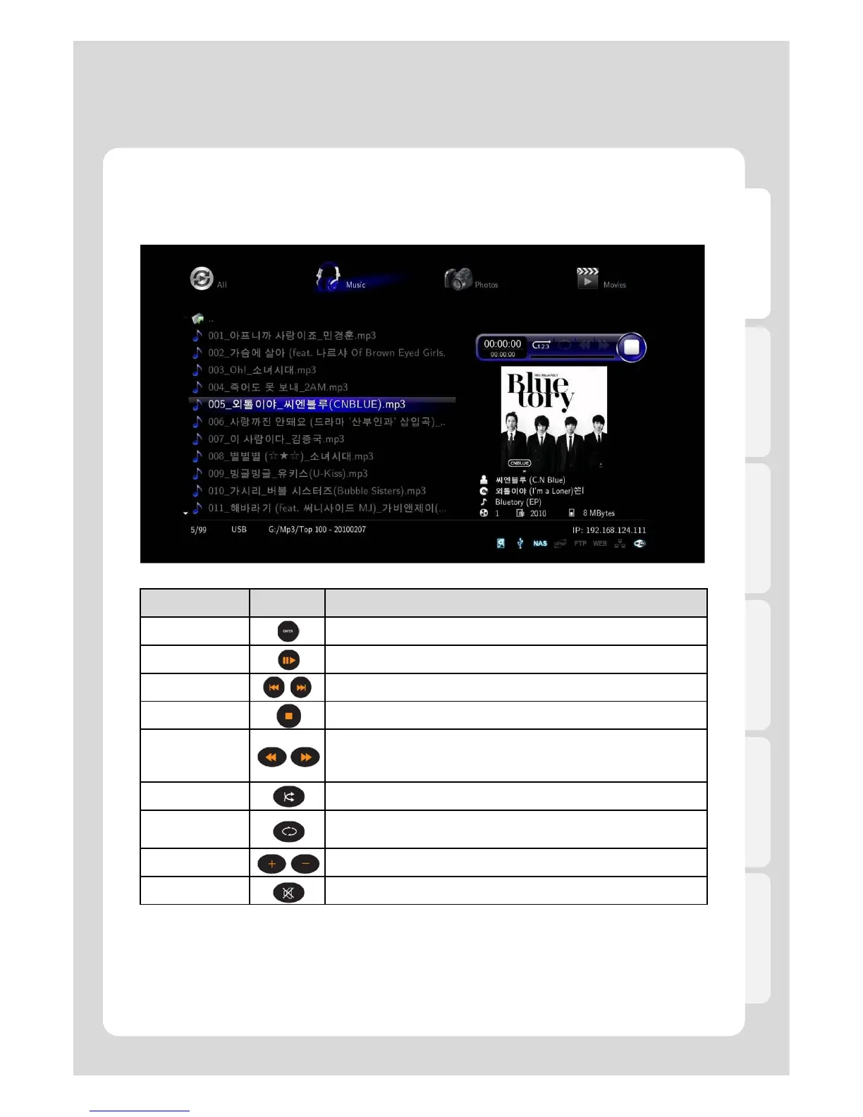 Usage of Remote Control functions in “Music” mode