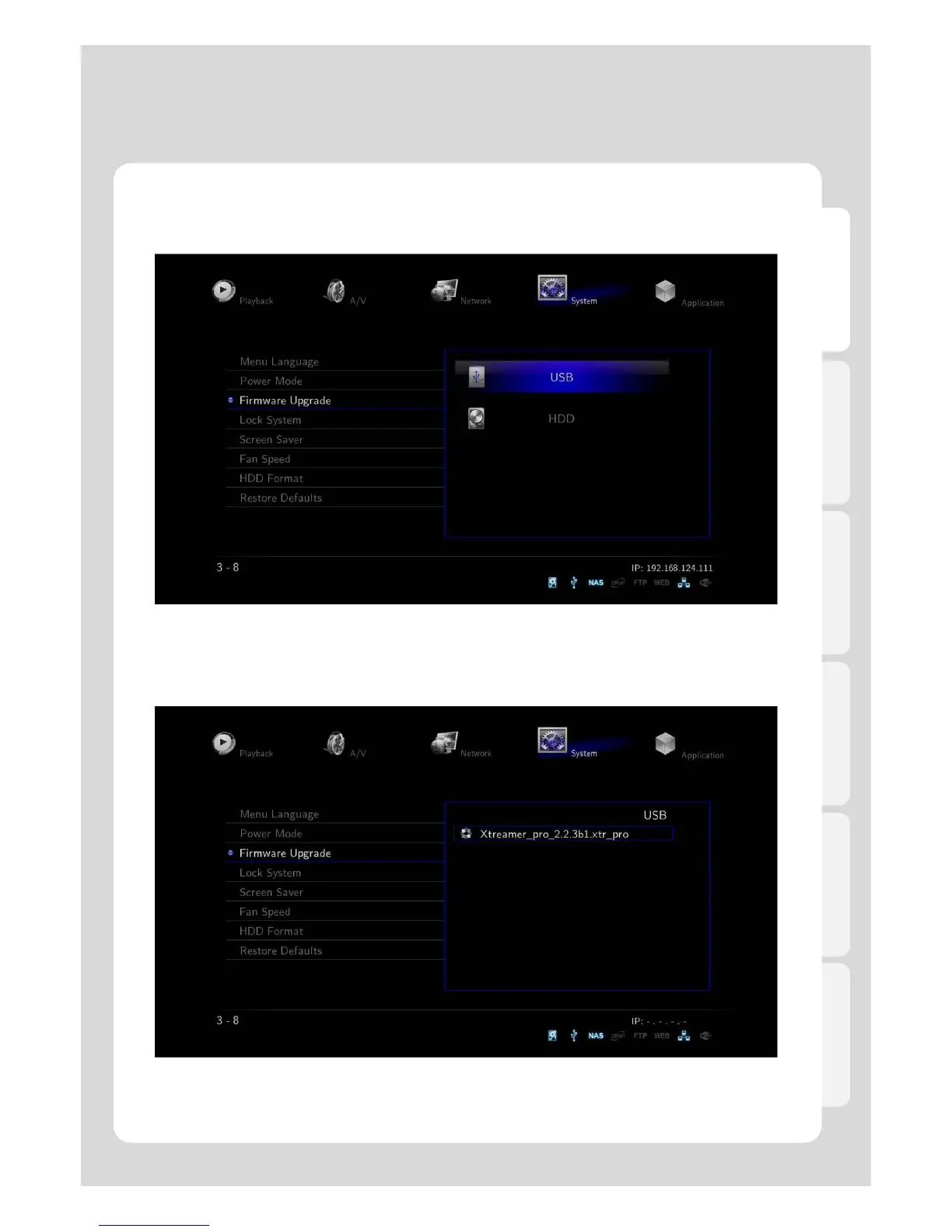 Select [Setting] – [System] – [Firmware Upgrade], and then look for saved firmware file then, select it.