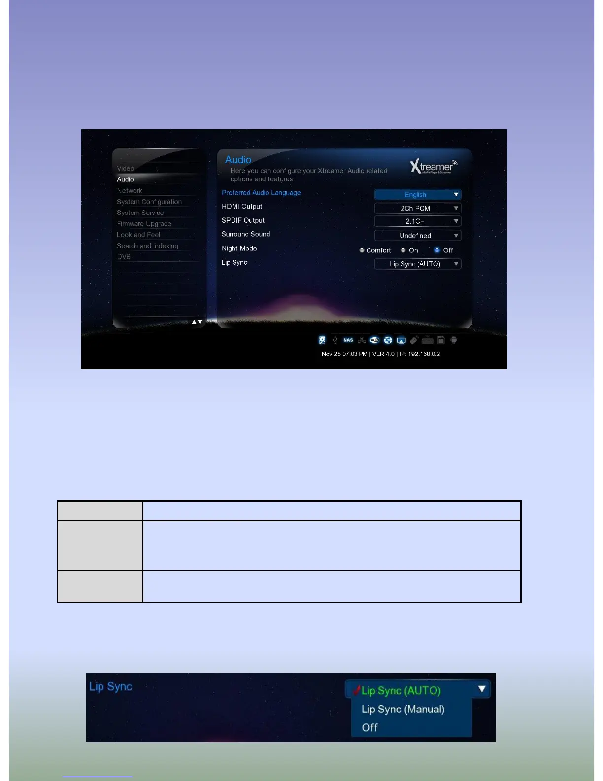 Xtreamer Prodigy - Audio Settings; Audio Output and Synchronization