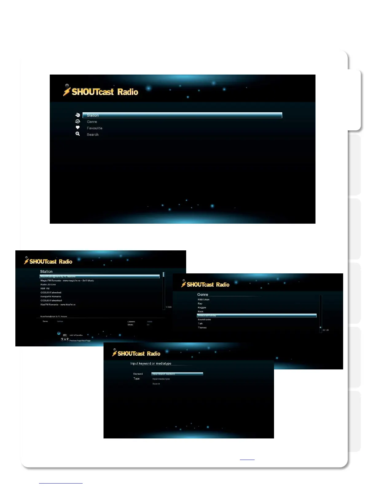 Check the predefined stations, browse by genres or search. Add stations to favorites.