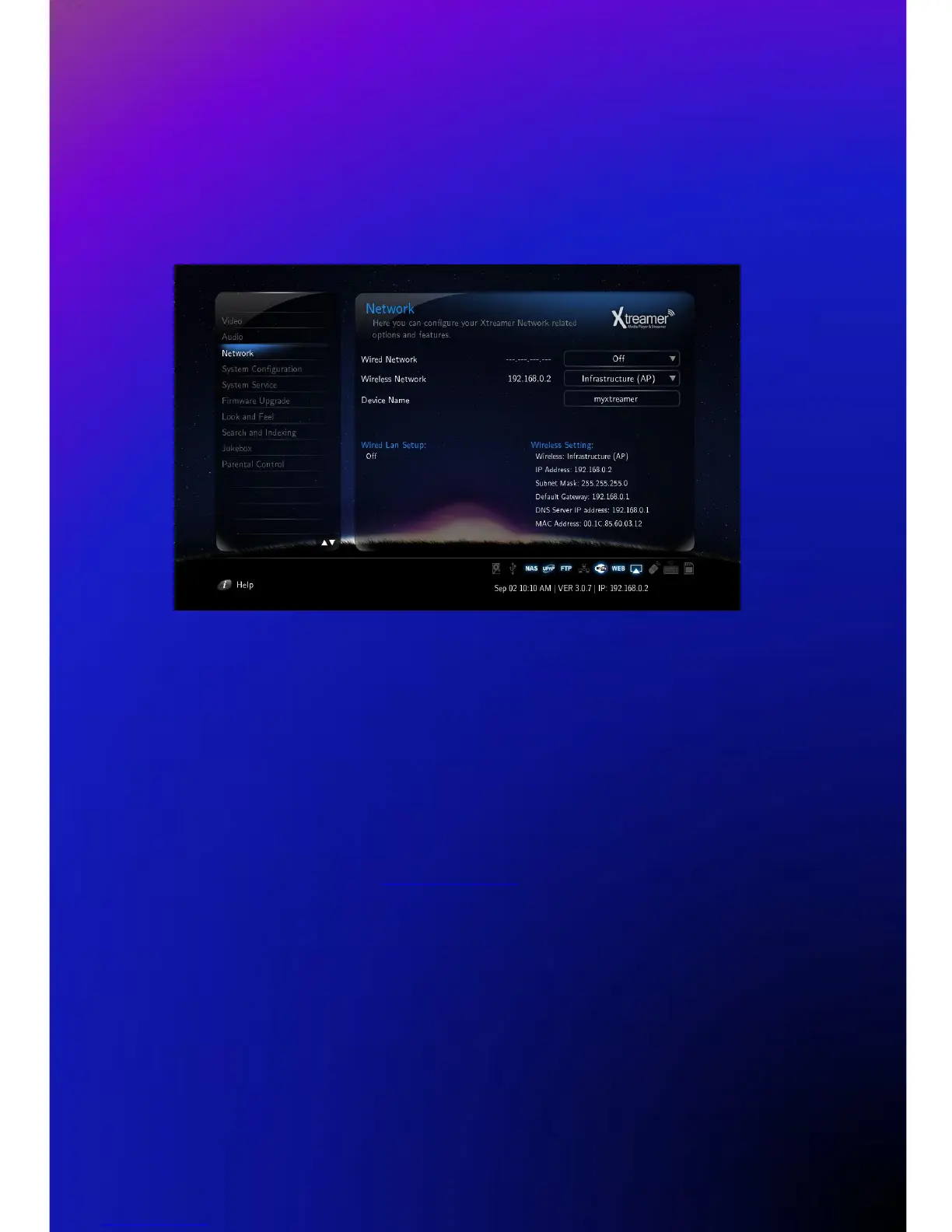 On the Settings -> Network screen you can setup your Xtreamer SideWinder 2 to connect to your home network.