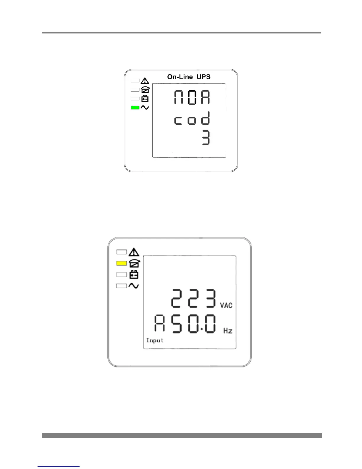 If UPS is in single mode, display shows “NOA” or ECO”