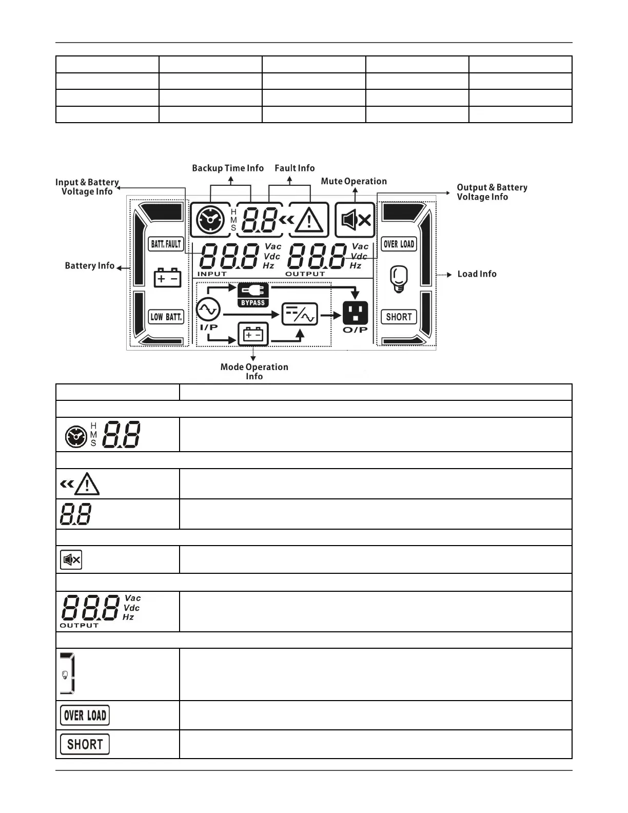 Vac: output voltage, Vdc: baery voltage, Hz: frequency