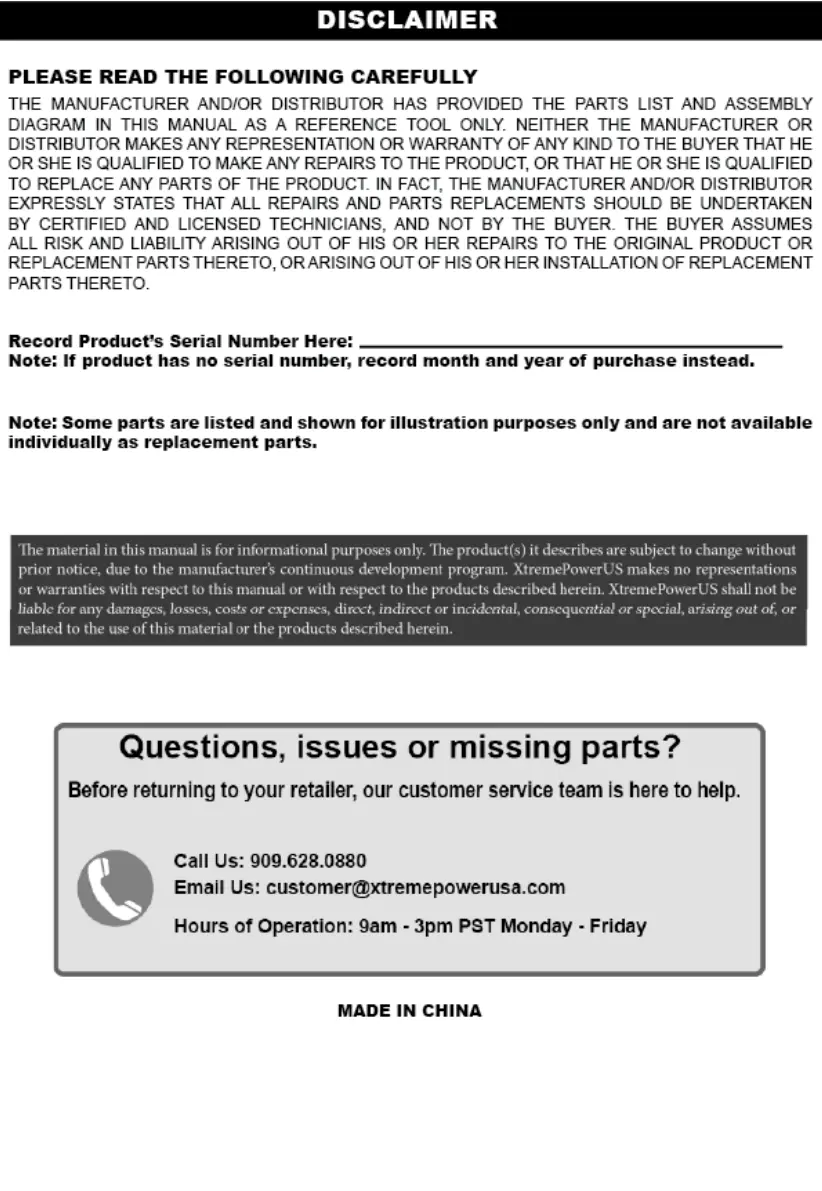 XtremepowerUS 75025 - Disclaimer; Customer Service and Contact Information