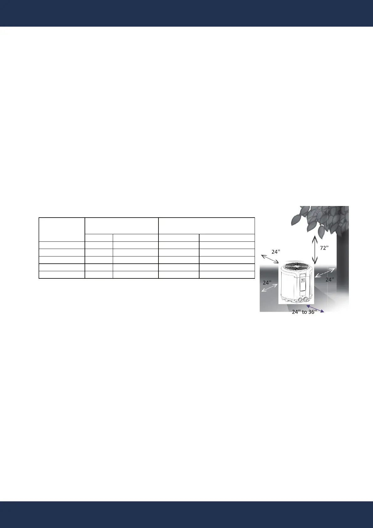 • Maintain a 72" clearance above for unobstructed air discharge and at least a 24" clearance