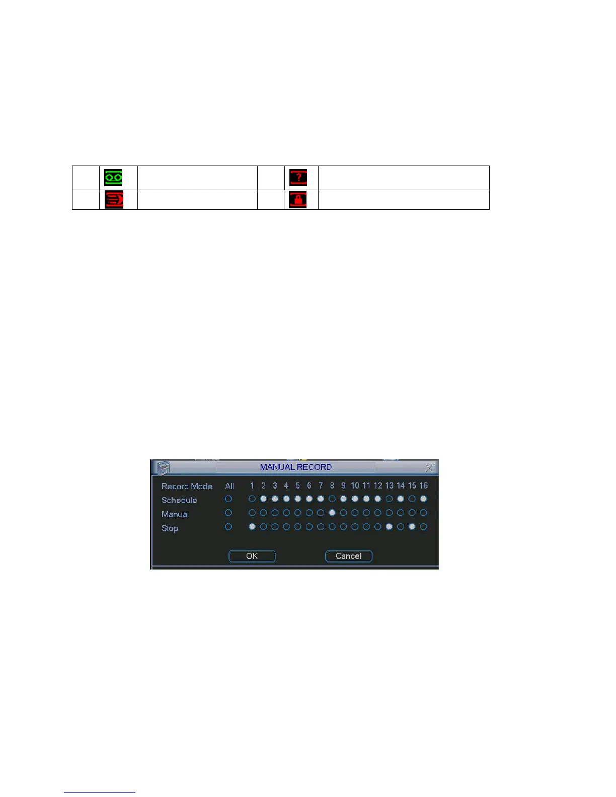 z Schedule: Channel records as you have set in recording setup (Main Menu->Setting->Schedule)