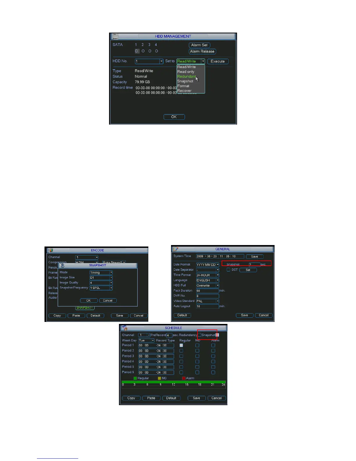 In Encode interface, click snapshot button to input snapshot mode, size, quality and frequency.