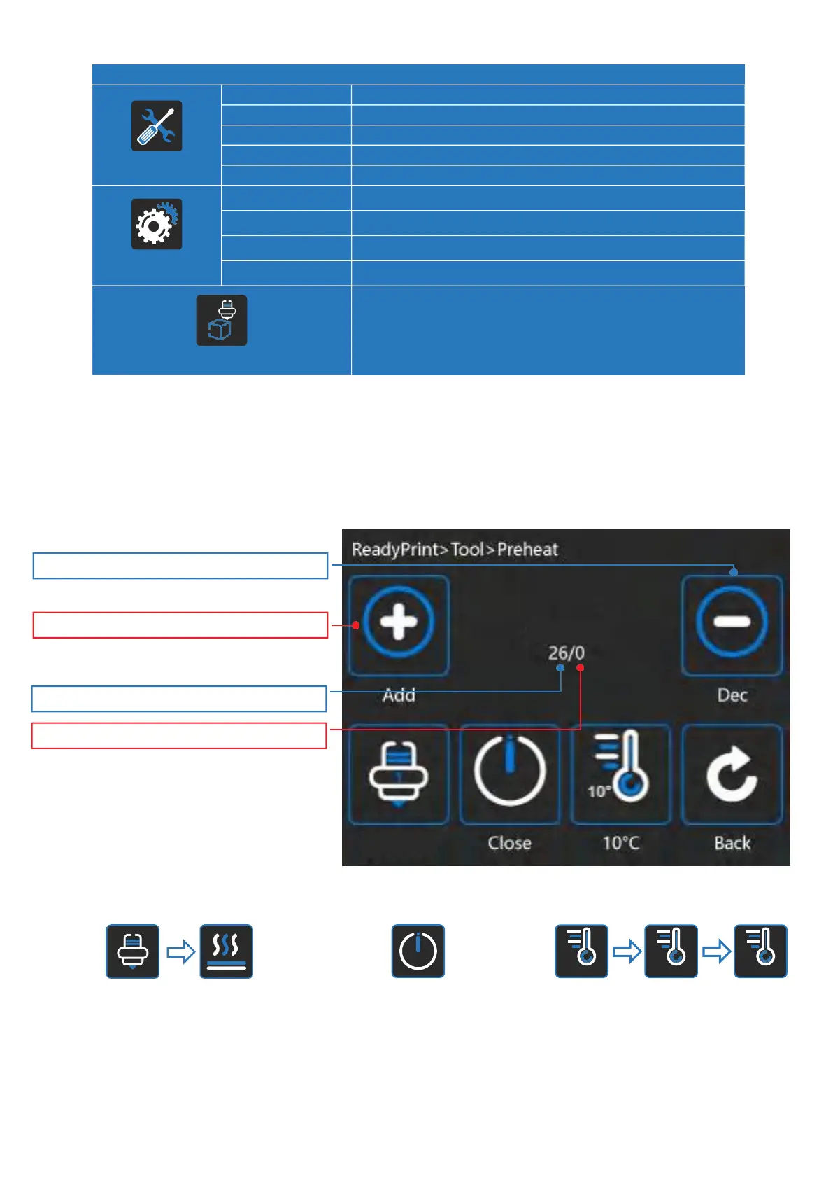 You can set the nozzle and hot bed temperature in the preheating interface.Click the nozzle icon to