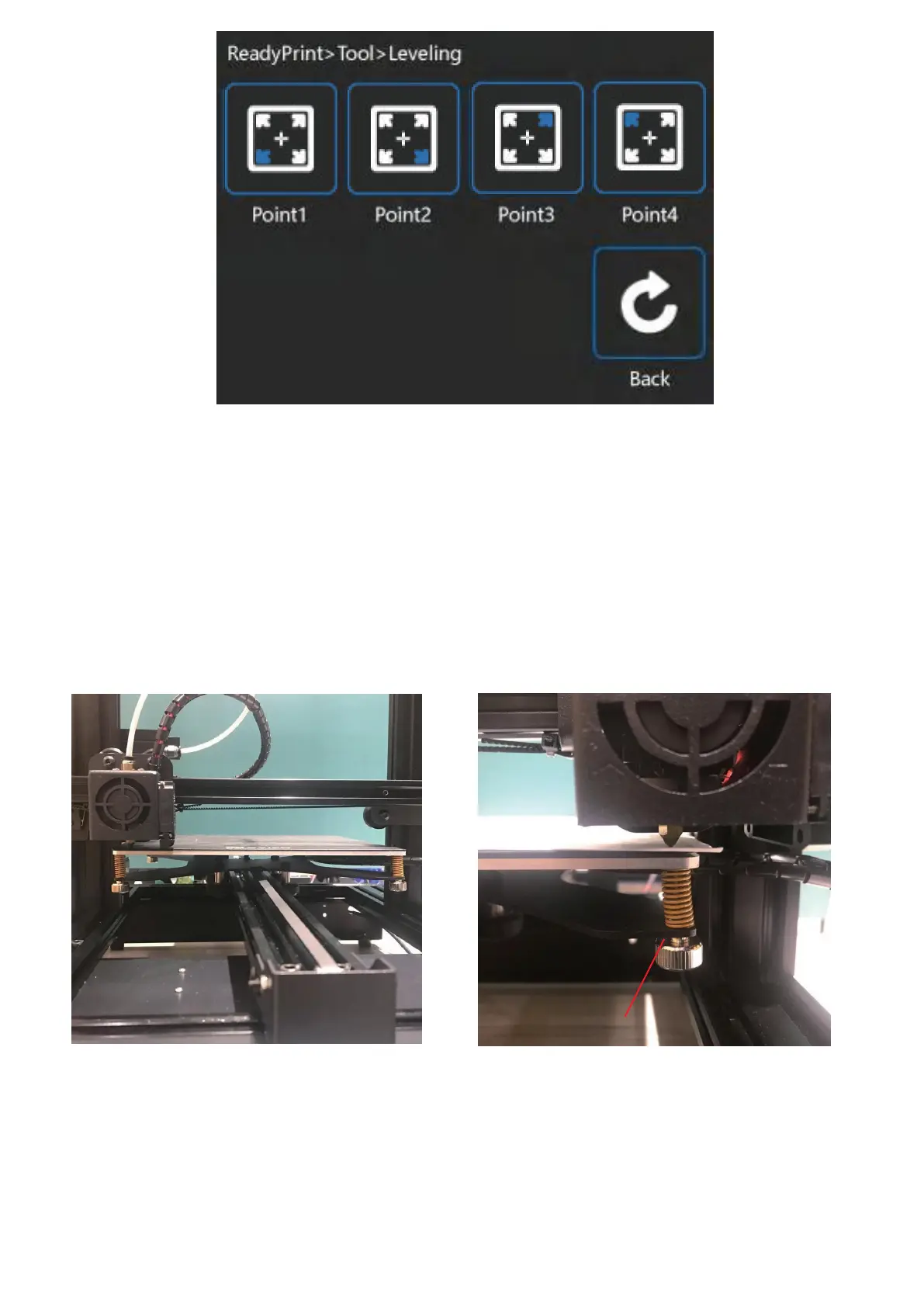 1. Tool →Leveling. Click point1 Wait for the nozzle to move to the left/front of the platform.