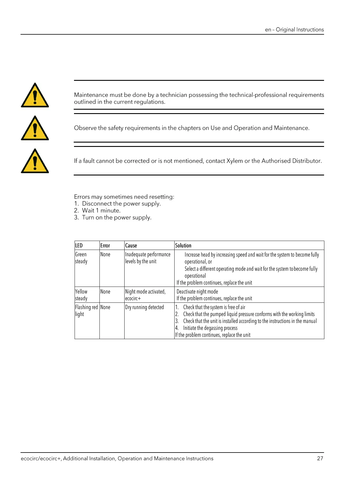 Xylem LOWARA ecocirc S - 8 Troubleshooting; Precautions; Resetting Errors; Insufficient Cooling or Heat