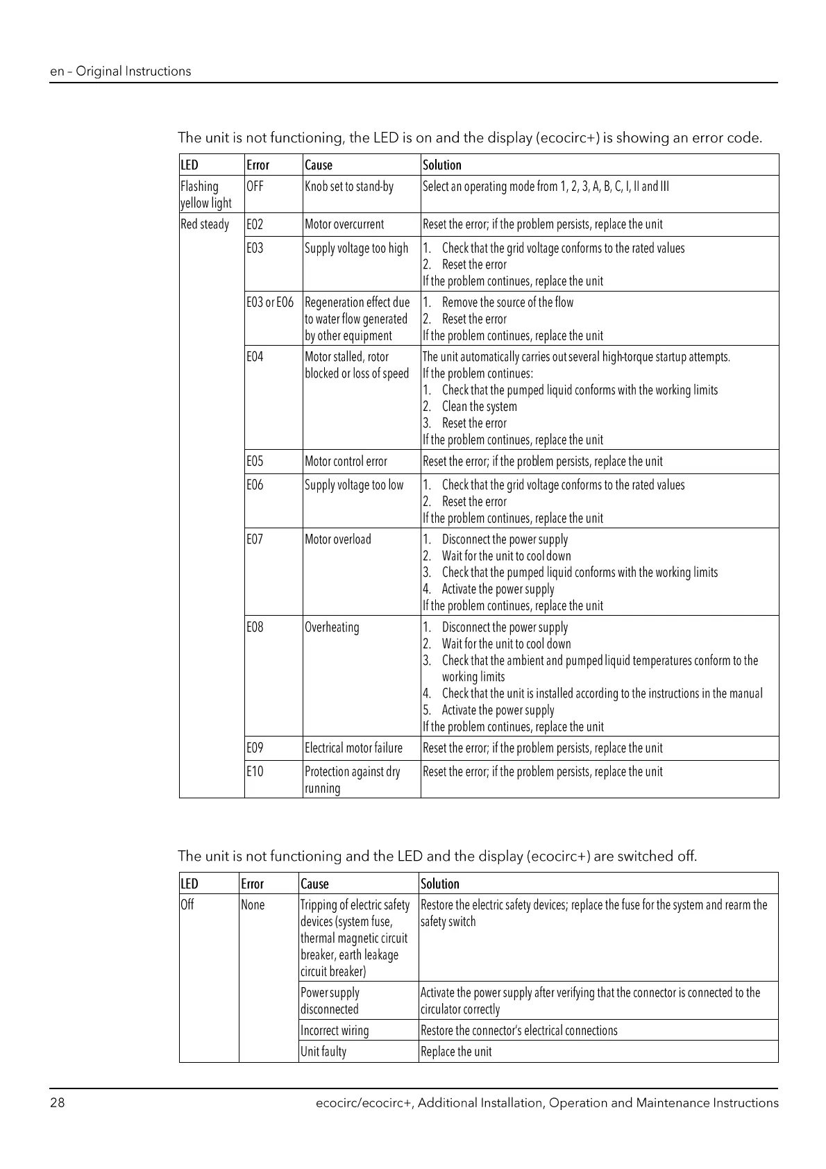 Xylem LOWARA ecocirc S - Unit Not Functioning and LED on; Unit Not Functioning and LED off