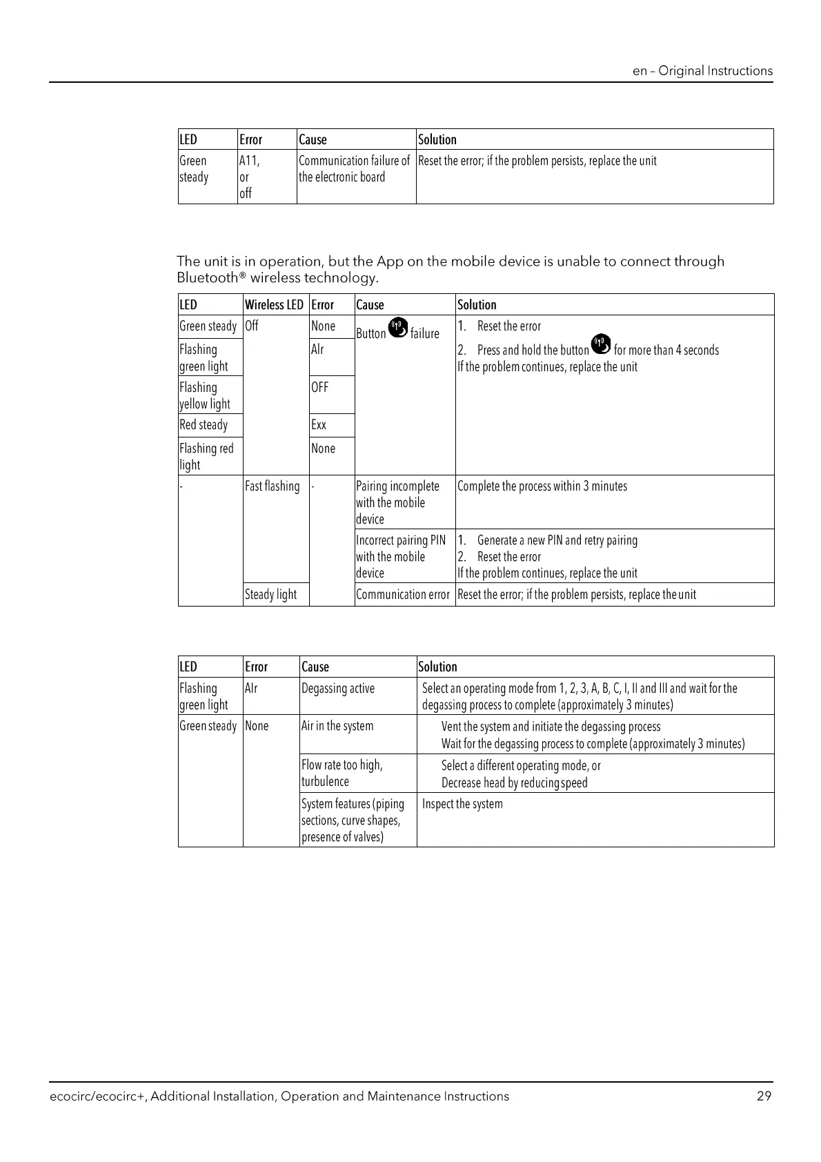 Xylem LOWARA ecocirc S - Loss of Functionality in the Unit; The Wireless Connection Is Not Functioning, Ecocirc; Noise Coming from the System