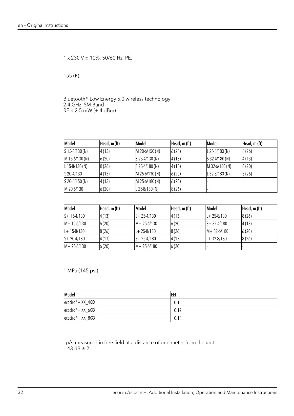 Xylem LOWARA ecocirc S - Electrical Specifications; Radiofrequency Specifications, Ecocirc; Maximum Head; Maximum Operating Pressure