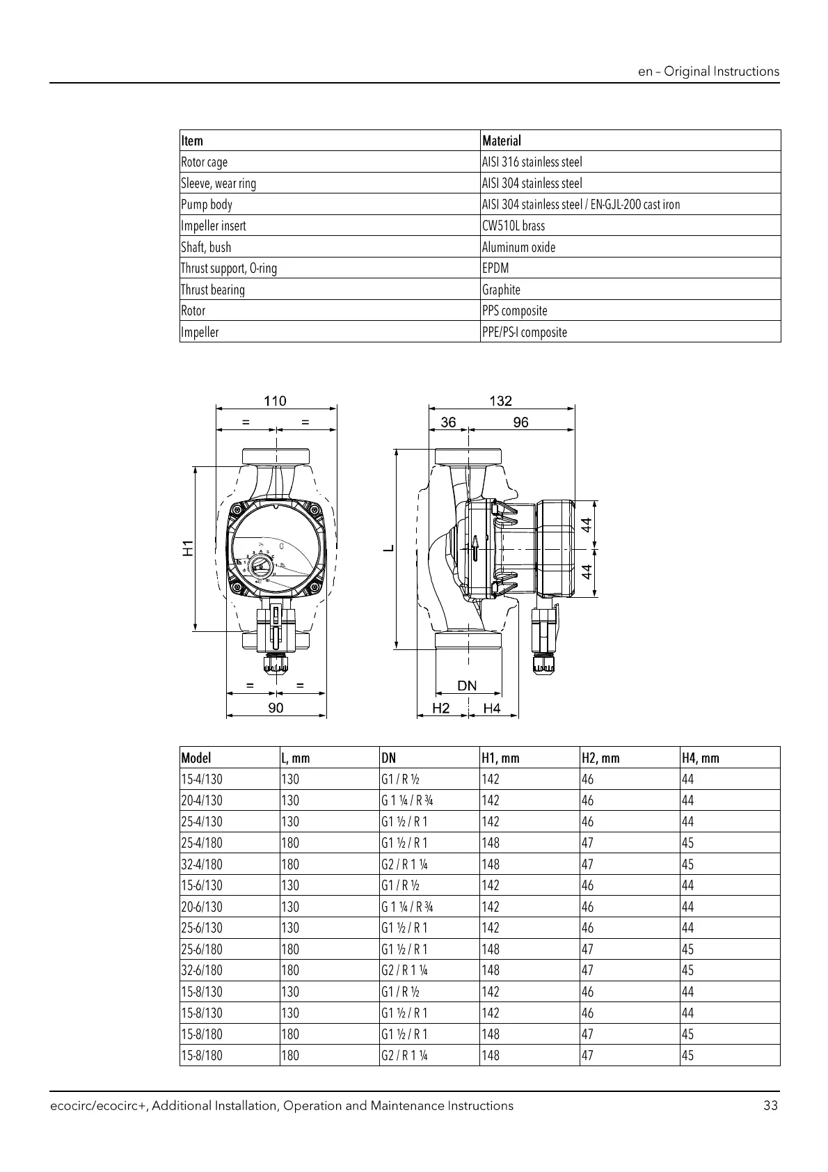 Xylem LOWARA ecocirc S - Materials in Contact with the Liquid; Dimensions and Weights