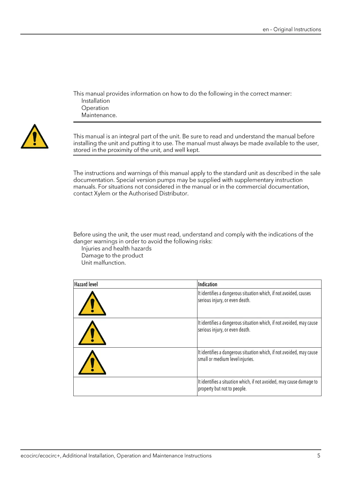 Xylem LOWARA ecocirc S - 1 Introduction and Safety; Introduction; Safety; Hazard Levels and Safety Symbols