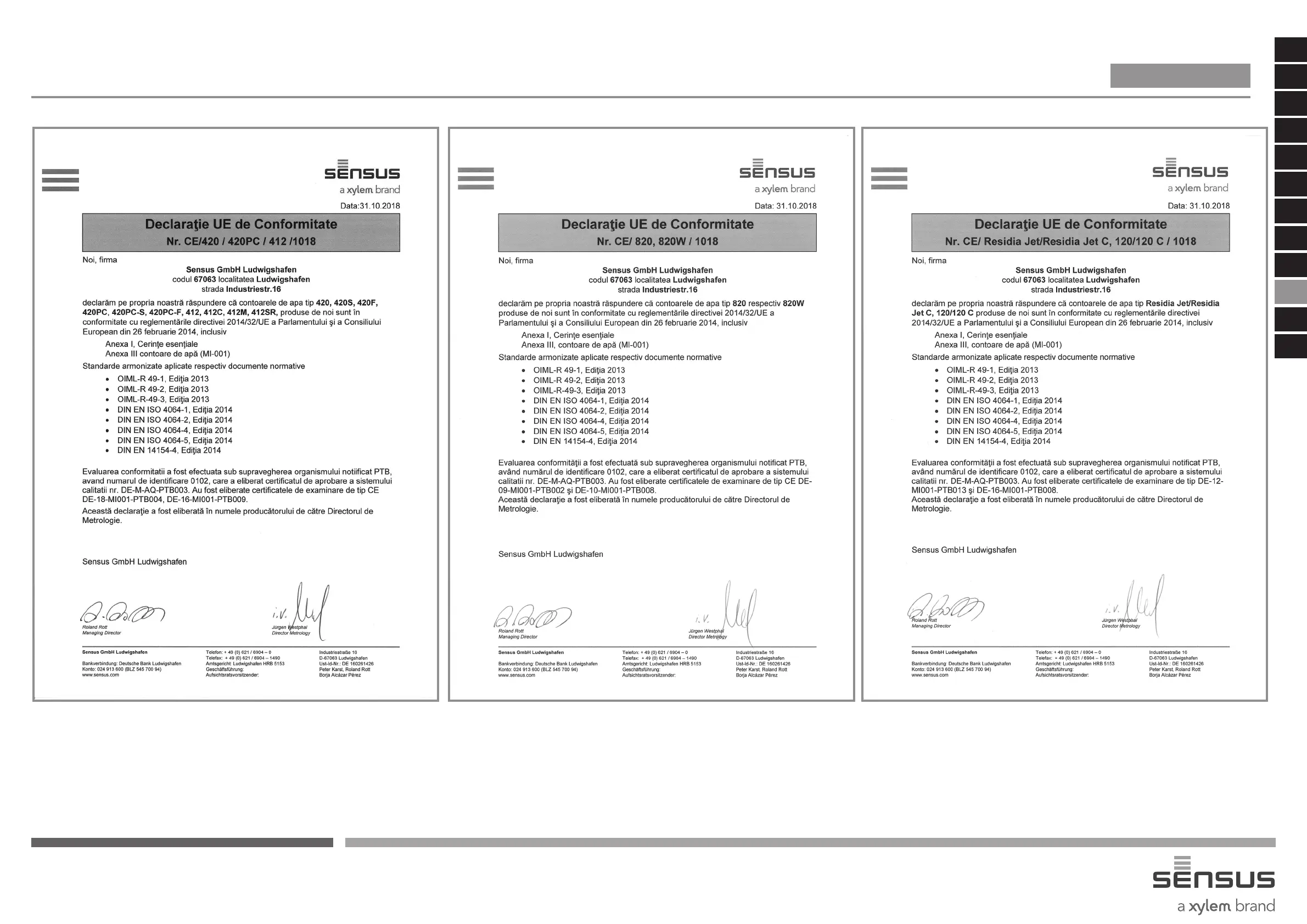 Declarații UE de conformitate pentru contoare de apă cu turbină.