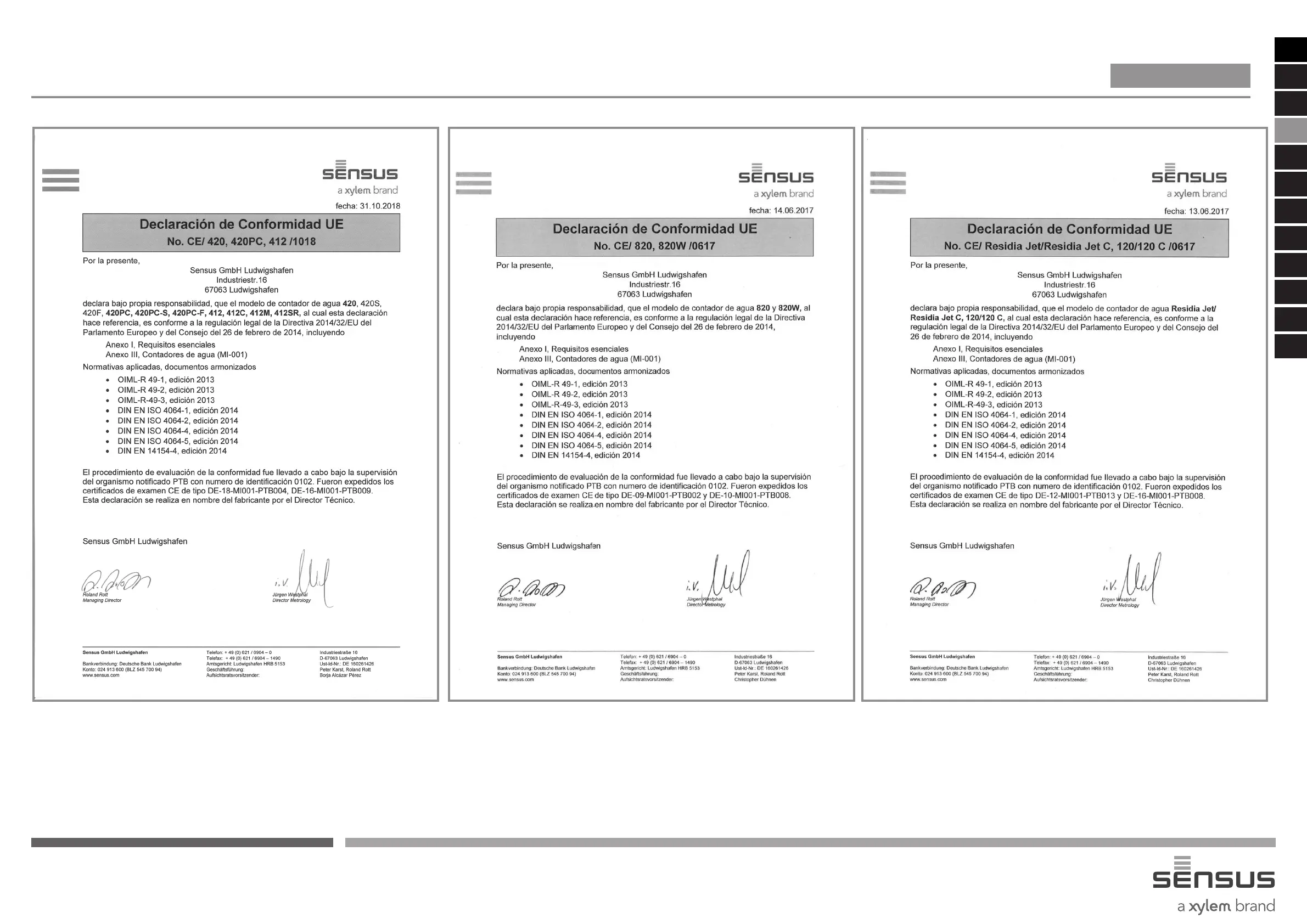 Declaraciones de conformidad para contadores de agua de velocidad