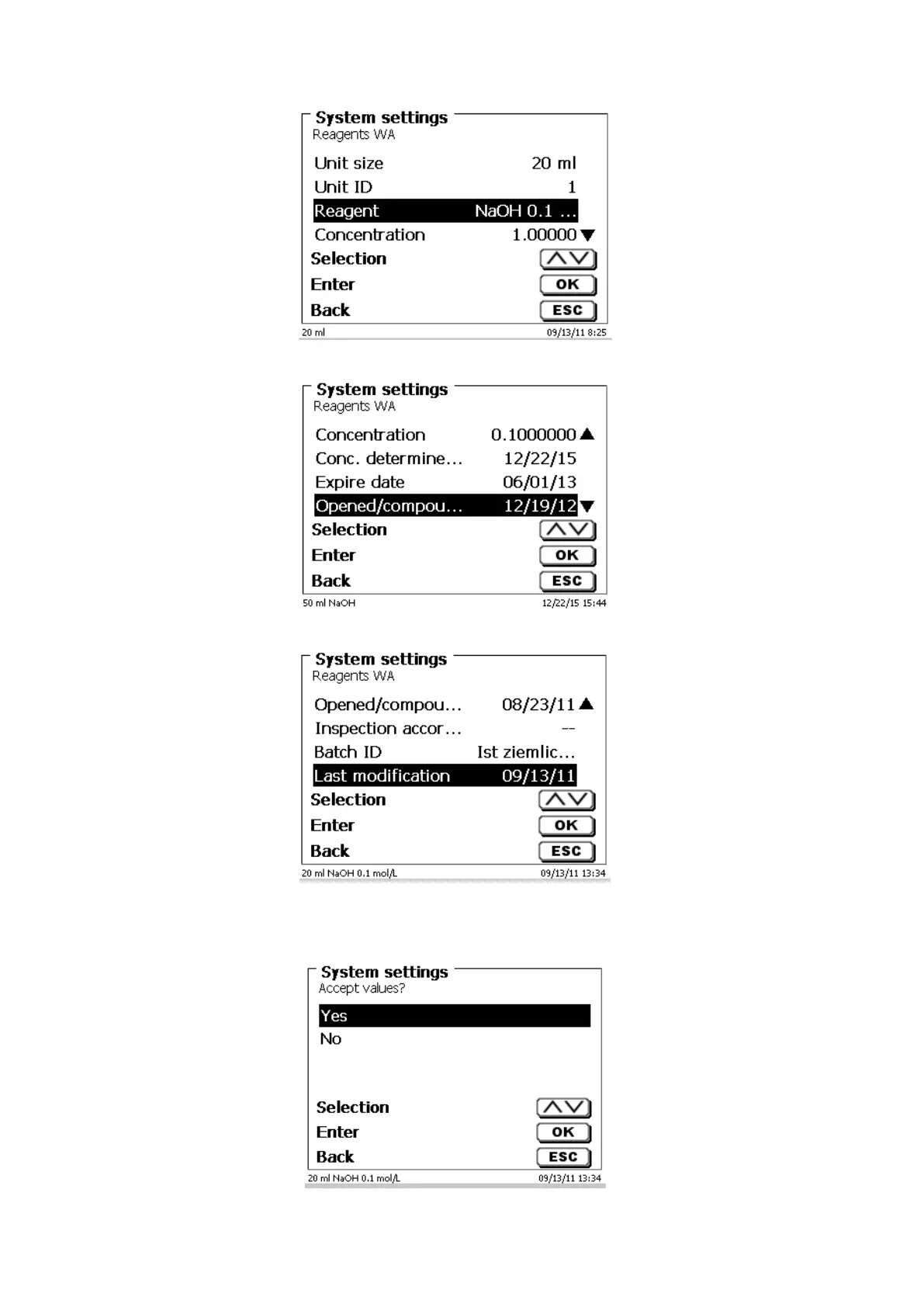When you leave the «Reagenzien WA» menu using <ESC>, you can adopt the values by «Yes» (Fig. 102).