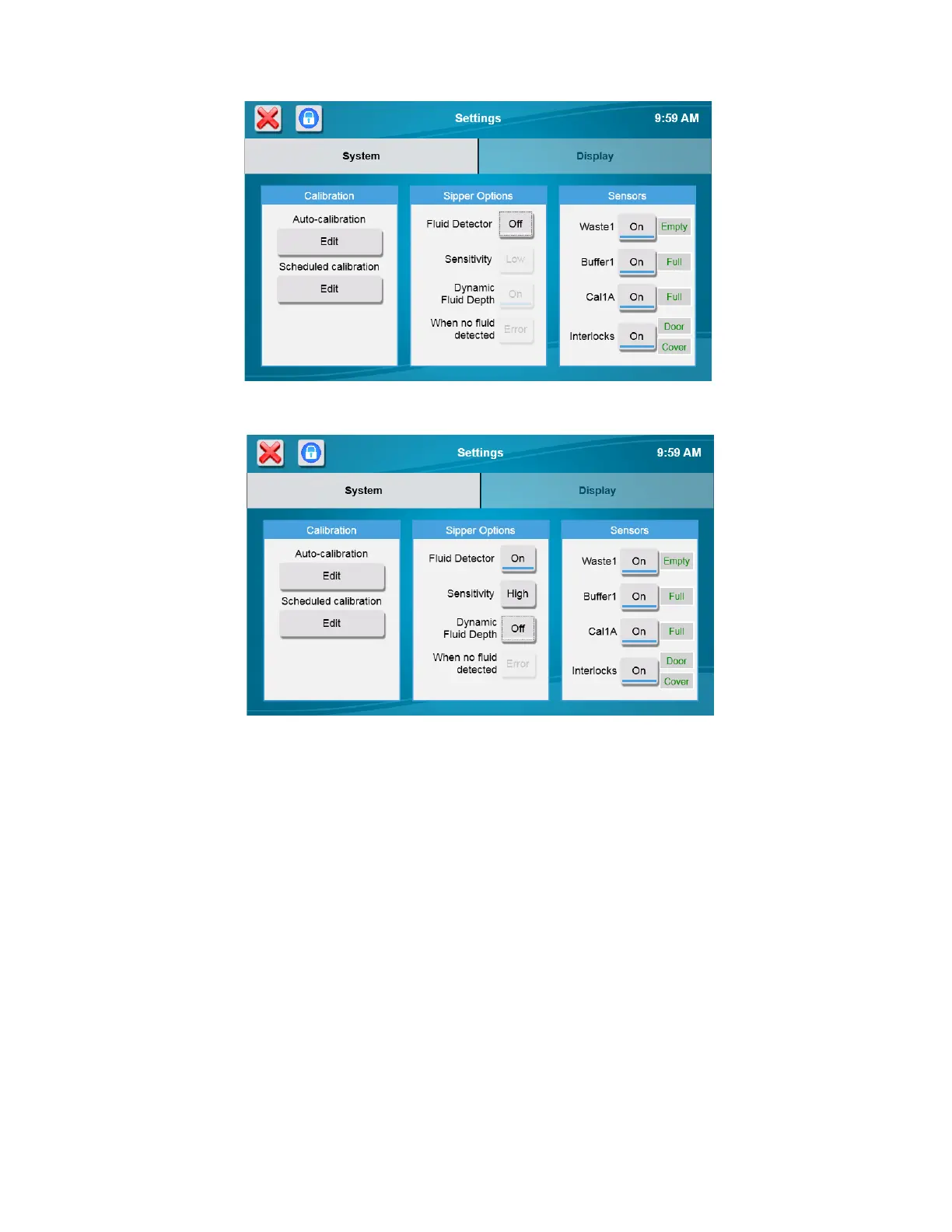 Touch the Dynamic Fluid Depth [On] button and change it to [Off] to disable sipper fluid detection and use fixed depth at