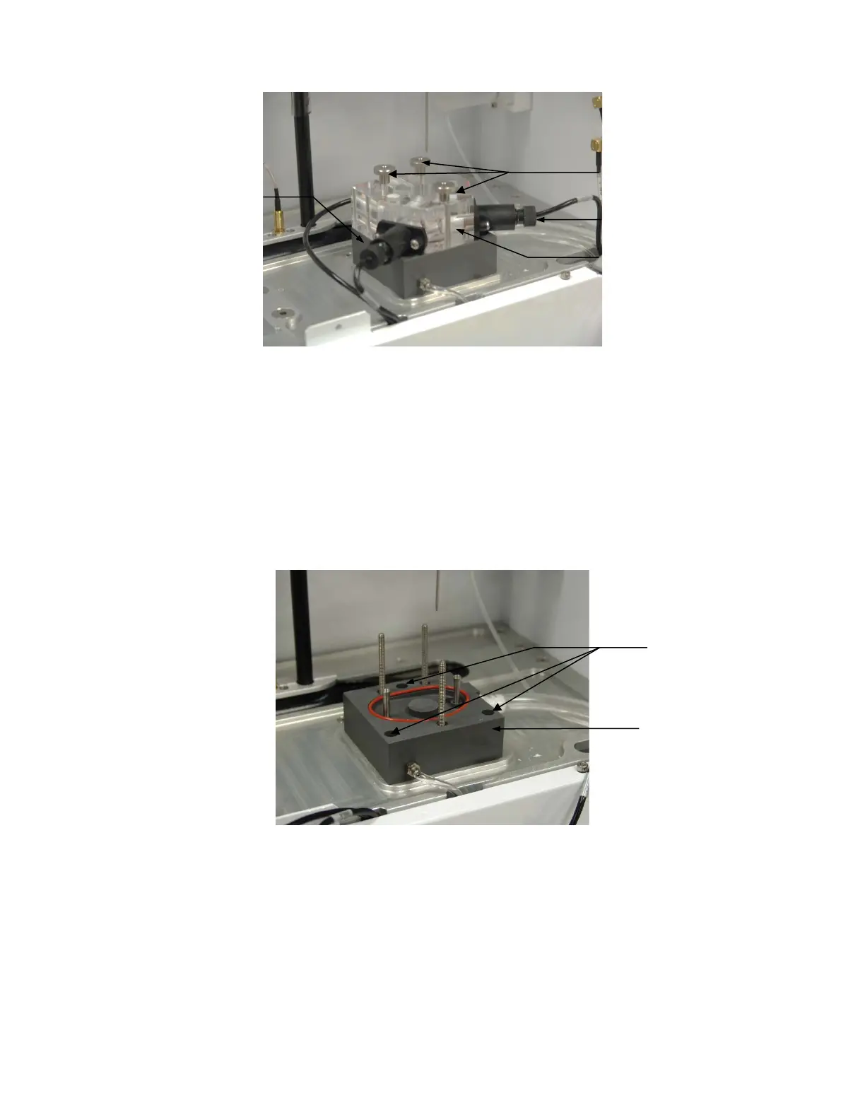 Unscrew the three hex screws from the top of the waste module. Disconnect the calibrator and waste tubing and remove
