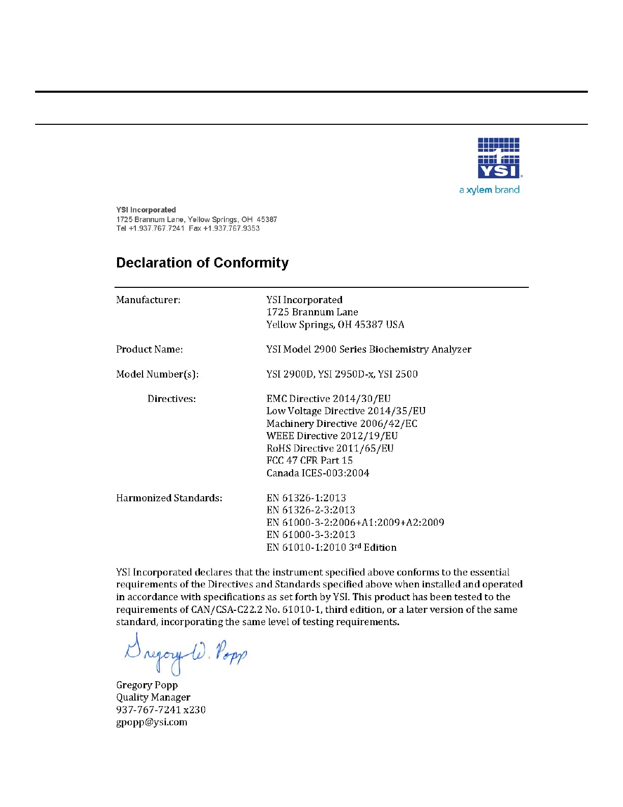 Xylem YSI 2500 - Notices; Declaration of Conformity