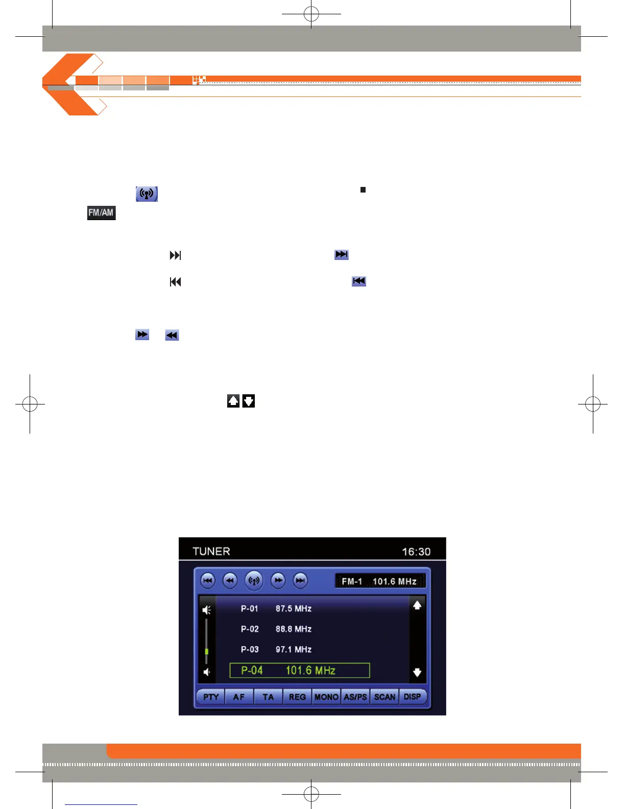 6 numbered preset buttons store and recall stations for each band. 6 stored stations (P01-P6) for