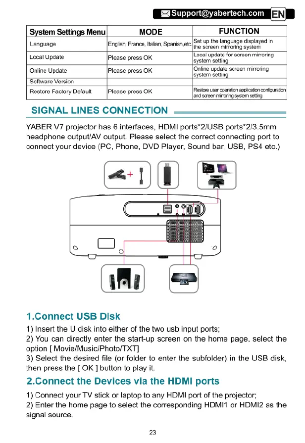 Yaber Pro V7 - Signal Line Connections; Connect USB Disk for Playback; Connect Devices via HDMI
