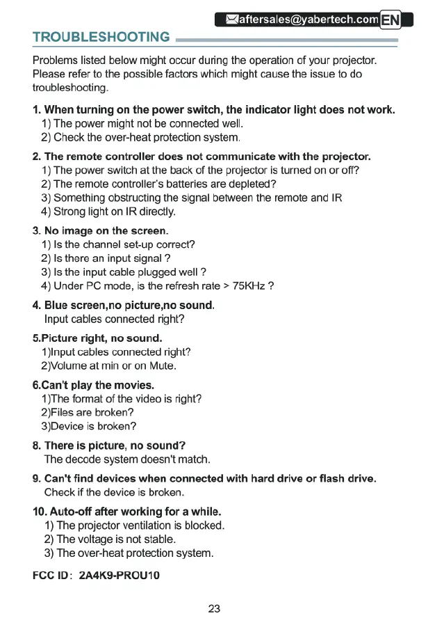 Yaber U10 - Troubleshooting Common Issues; Troubleshooting: Power Indicator Issues; Troubleshooting: Remote Control Communication; Troubleshooting: No Image Display