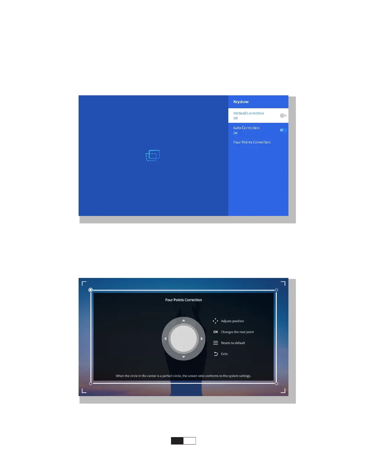 Gå til Indstilling-> Keystone -> Firepunktskorrektion